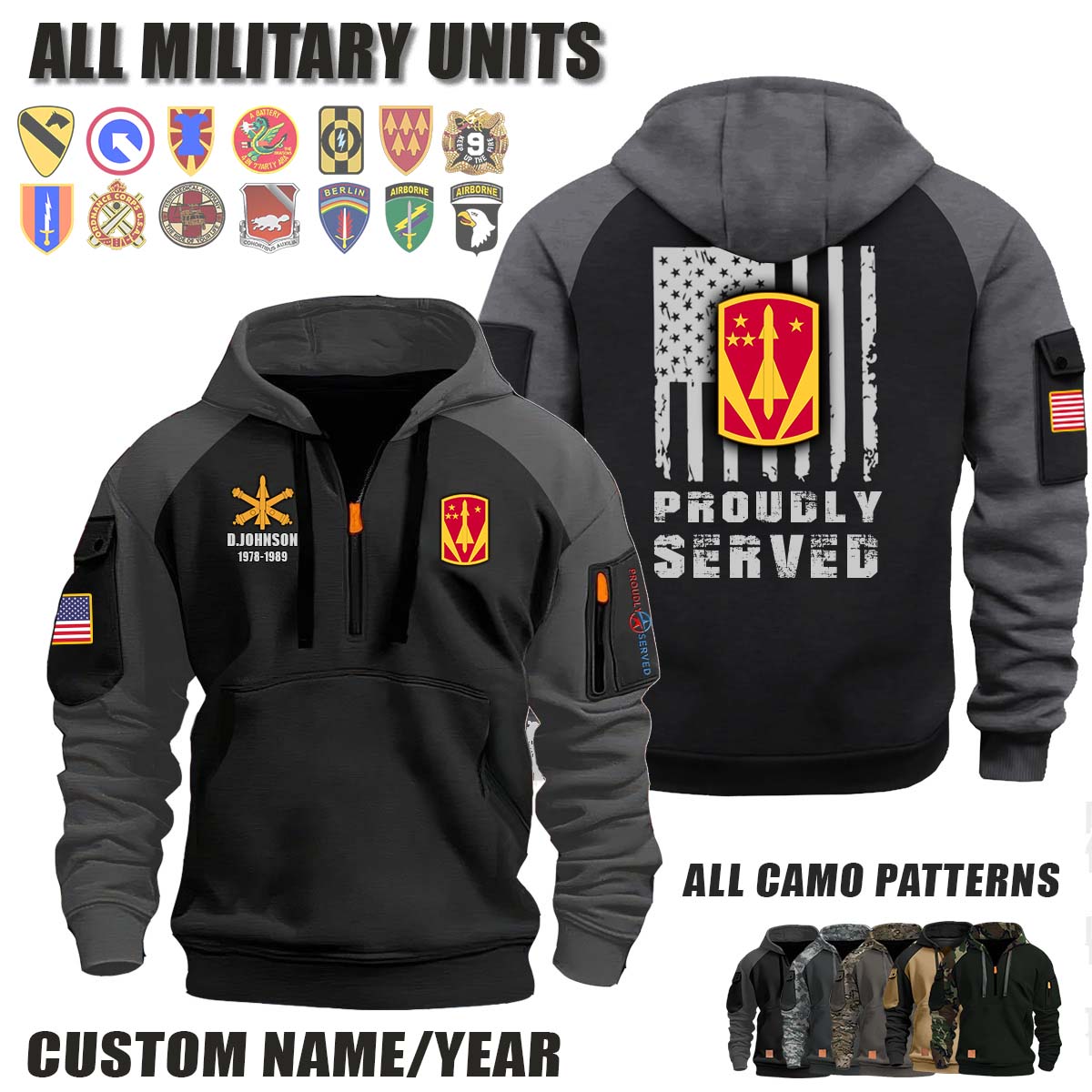 This 31st ADA BDE 31st Air Defense Artillery Brigade_Camo Halfzip Hoodie lets you customize your Branch, Unit, Role, Rank, and Years Served — so your service, sacrifice, and pride live on.