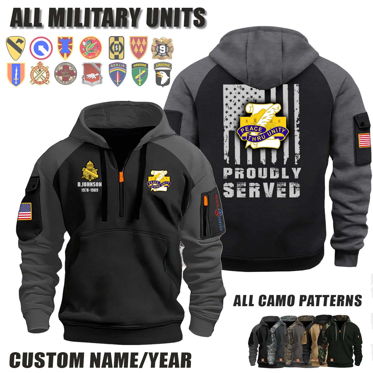 This 321st CA BDE 321st Civil Affairs Brigade_Camo Halfzip Hoodie lets you customize your Branch, Unit, Role, Rank, and Years Served — so your service, sacrifice, and pride live on.