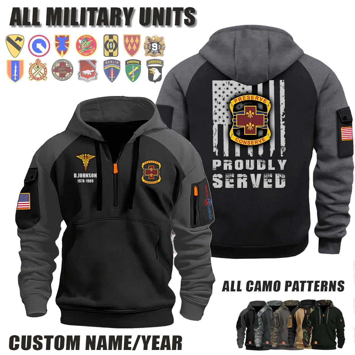 This 323rd CSH 323rd Combat Support Hospital_Camo Halfzip Hoodie lets you customize your Branch, Unit, Role, Rank, and Years Served — so your service, sacrifice, and pride live on.