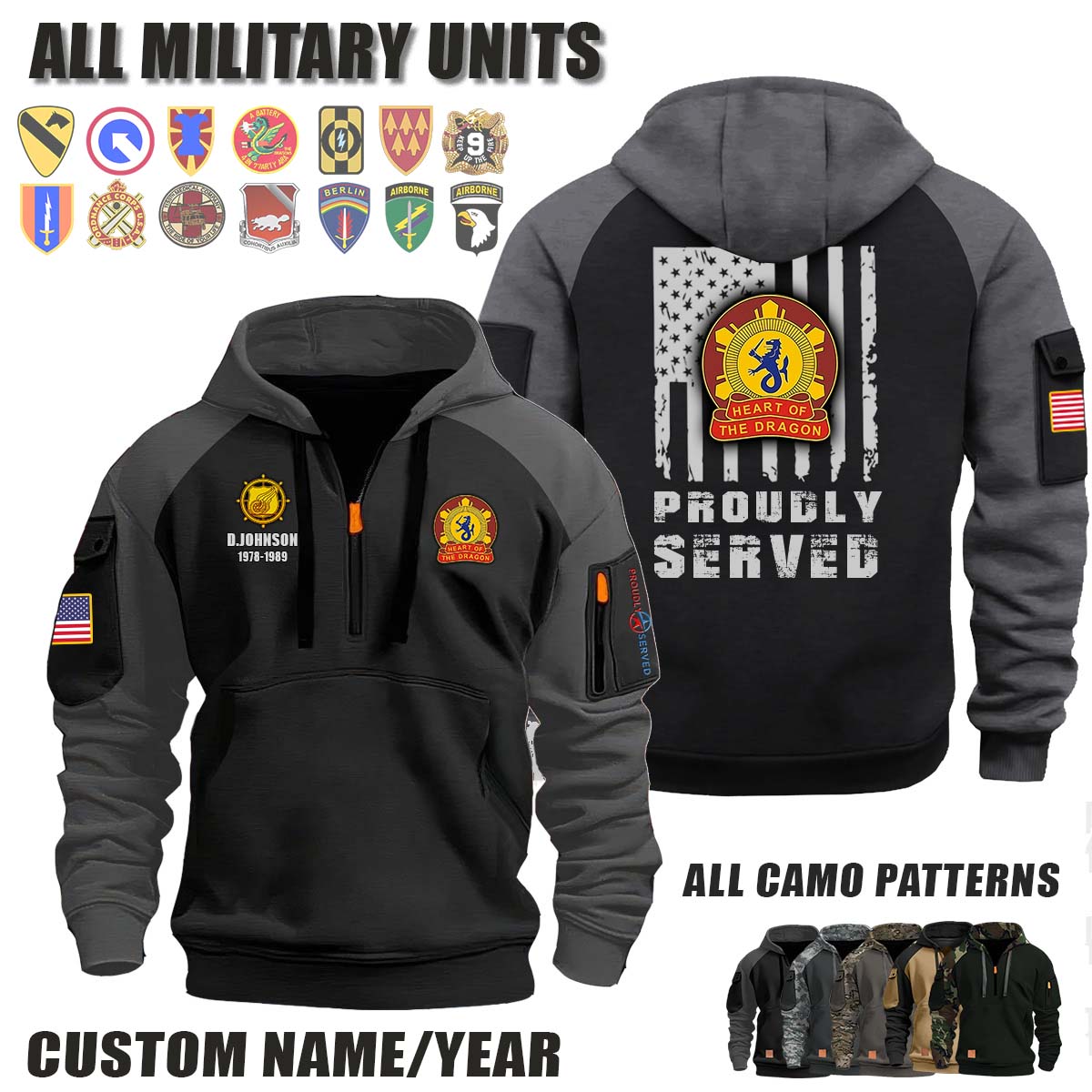 This 330th TRANS BN 330th Transportation Battalion_Camo Halfzip Hoodie lets you customize your Branch, Unit, Role, Rank, and Years Served — so your service, sacrifice, and pride live on.