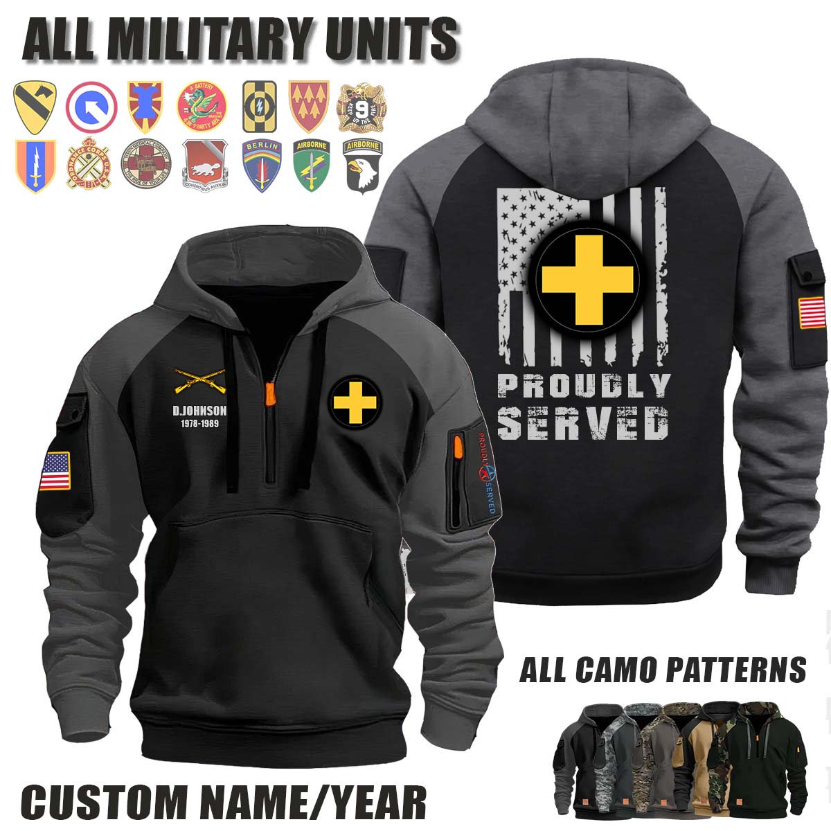 This 33rd IBCT 33rd Infantry Brigade Combat Team_Camo Halfzip Hoodie lets you customize your Branch, Unit, Role, Rank, and Years Served — so your service, sacrifice, and pride live on.