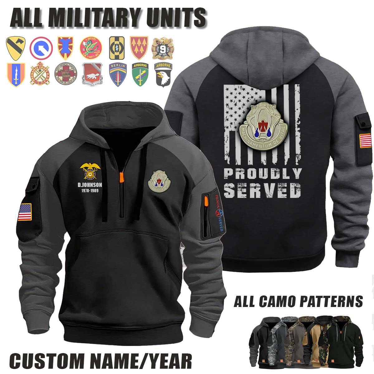 This 345th QM BN 345th Quartermaster Battalion_Camo Halfzip Hoodie lets you customize your Branch, Unit, Role, Rank, and Years Served — so your service, sacrifice, and pride live on.