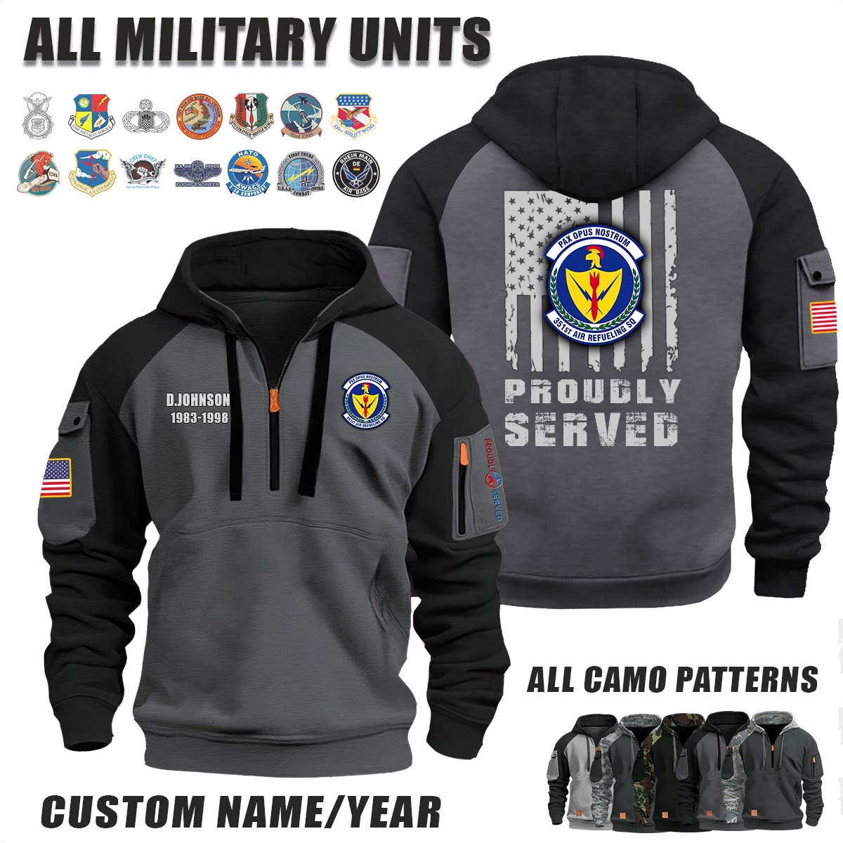 This 351st ARS Air Refueling Squadron_Camo Halfzip Hoodie lets you customize your Branch, Unit, Role, Rank, and Years Served — so your service, sacrifice, and pride live on.