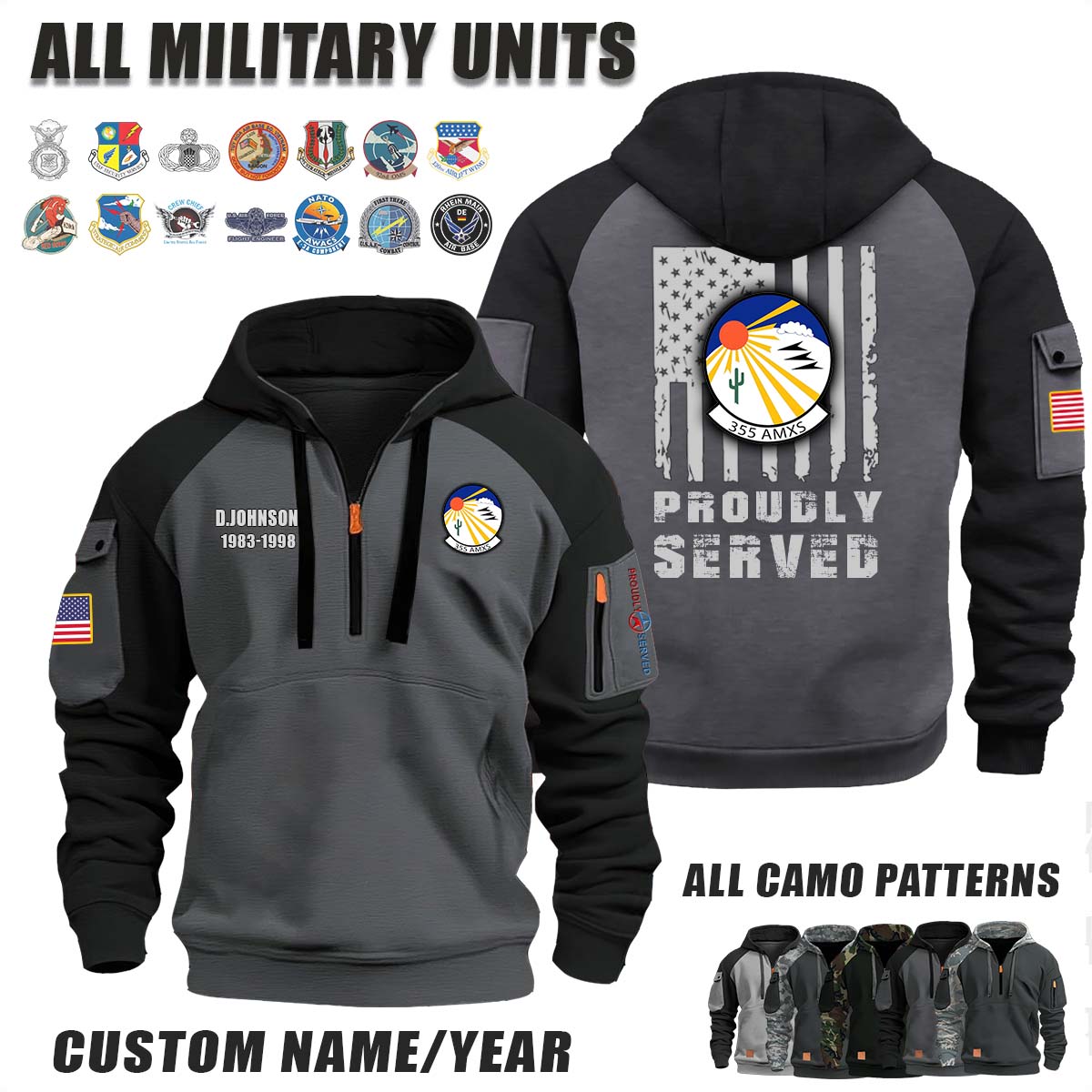 This 355th AMXS 355th Aircraft Maintenance Squadron_Camo Halfzip Hoodie lets you customize your Branch, Unit, Role, Rank, and Years Served — so your service, sacrifice, and pride live on.
