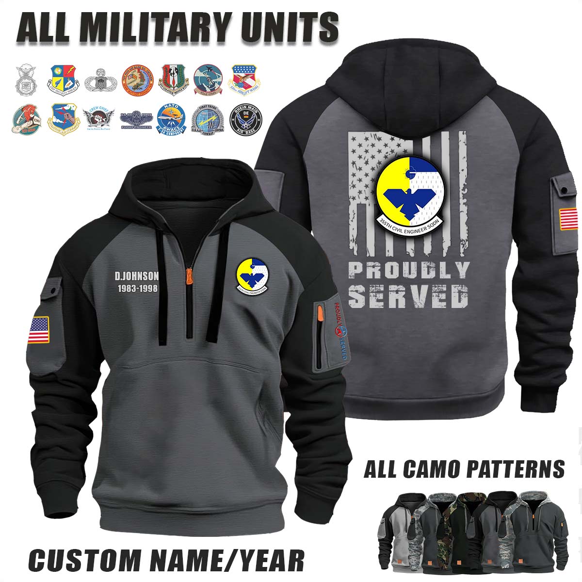 This 355th CES Civil Engineer Squadron_Camo Halfzip Hoodie lets you customize your Branch, Unit, Role, Rank, and Years Served — so your service, sacrifice, and pride live on.