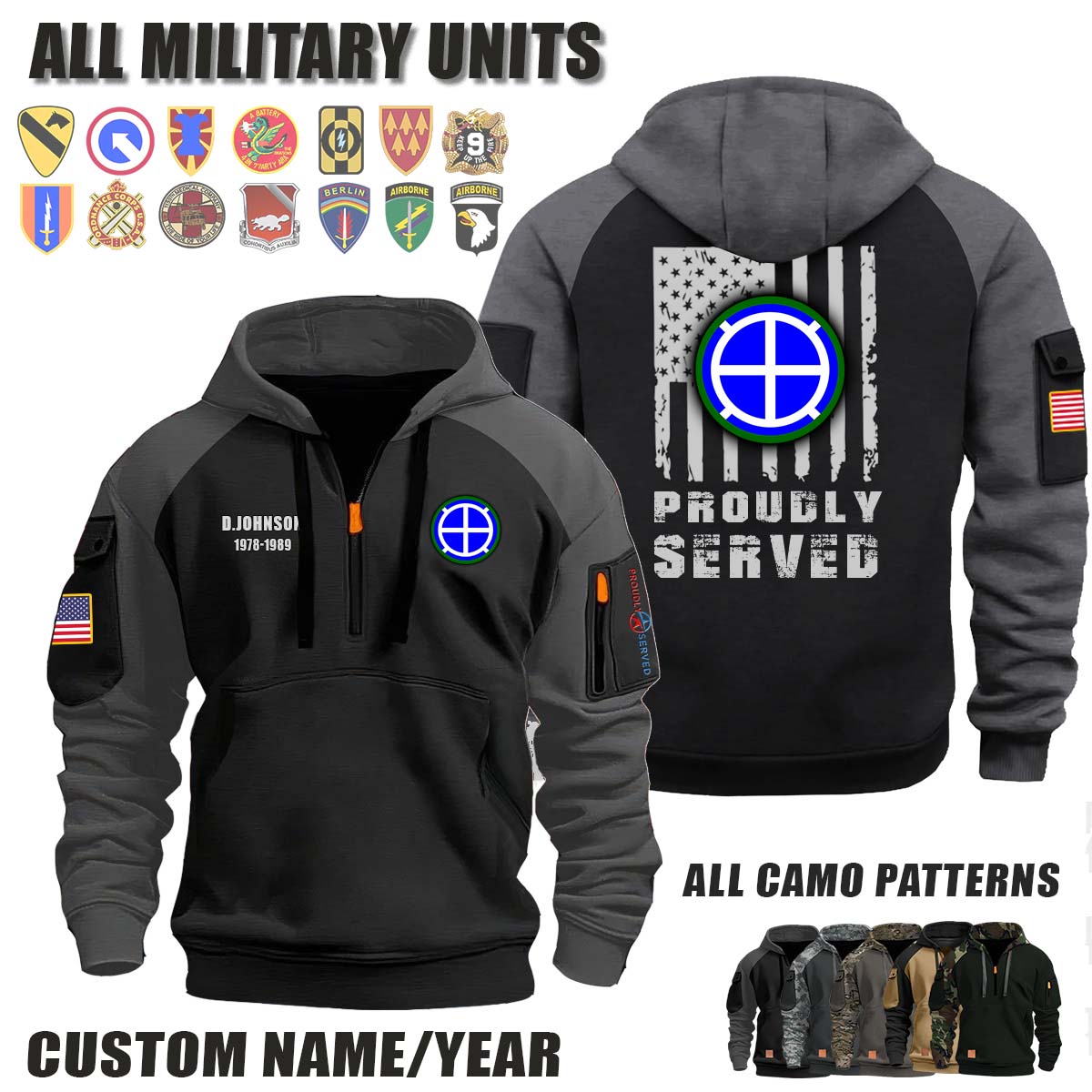 This 35th ID 35th Infantry Division_Camo Halfzip Hoodie lets you customize your Branch, Unit, Role, Rank, and Years Served — so your service, sacrifice, and pride live on.