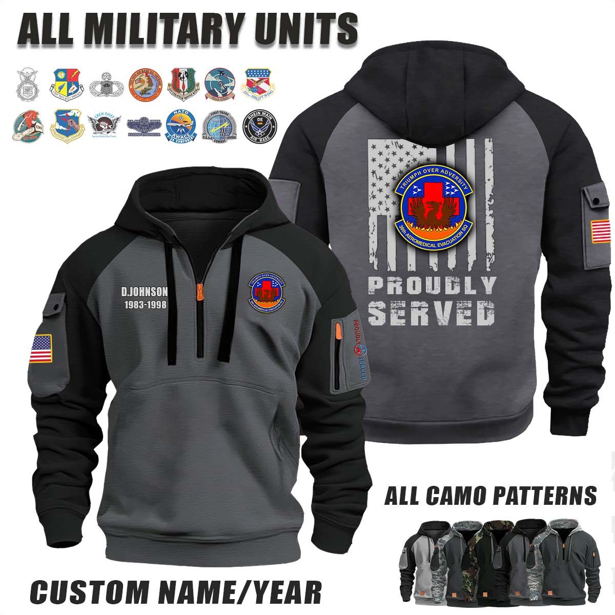 This 36th AES Aeromedical Evacuation Squadron_Camo Halfzip Hoodie lets you customize your Branch, Unit, Role, Rank, and Years Served — so your service, sacrifice, and pride live on.