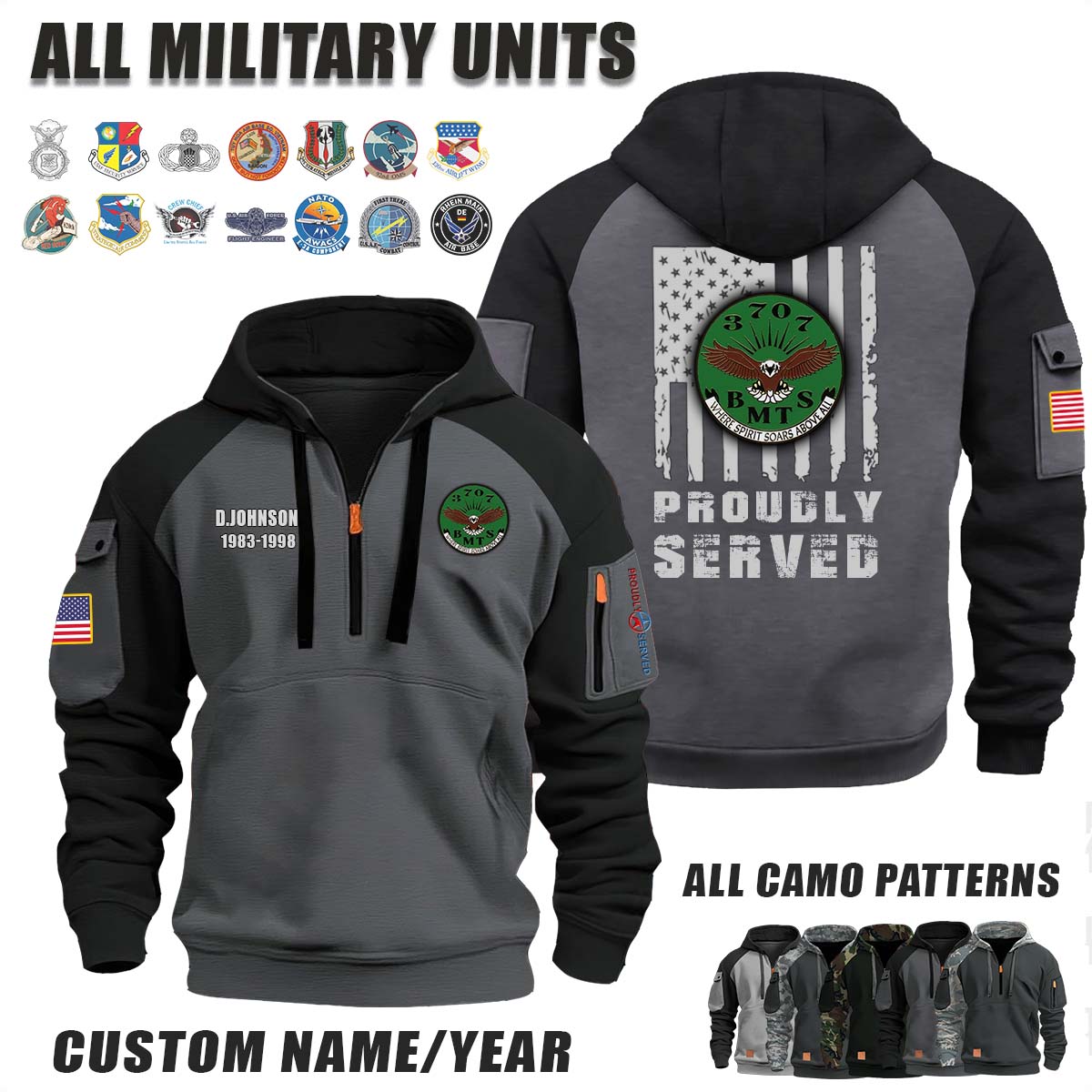 This 3707 BMTS Basic Military Training Squadron_Camo Halfzip Hoodie lets you customize your Branch, Unit, Role, Rank, and Years Served — so your service, sacrifice, and pride live on.