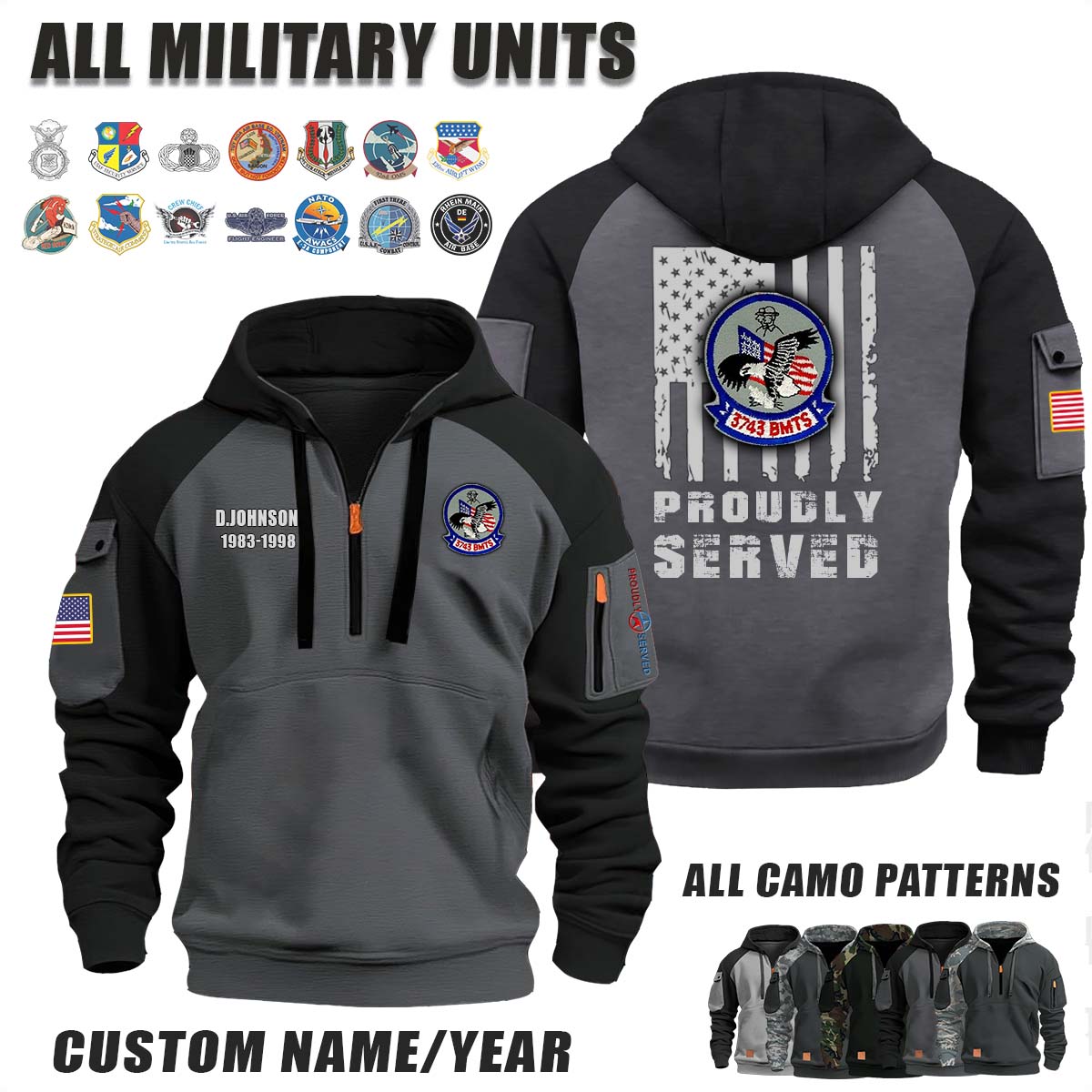 This 3743 BMTS Basic Military Training Squadron_Camo Halfzip Hoodie lets you customize your Branch, Unit, Role, Rank, and Years Served — so your service, sacrifice, and pride live on.