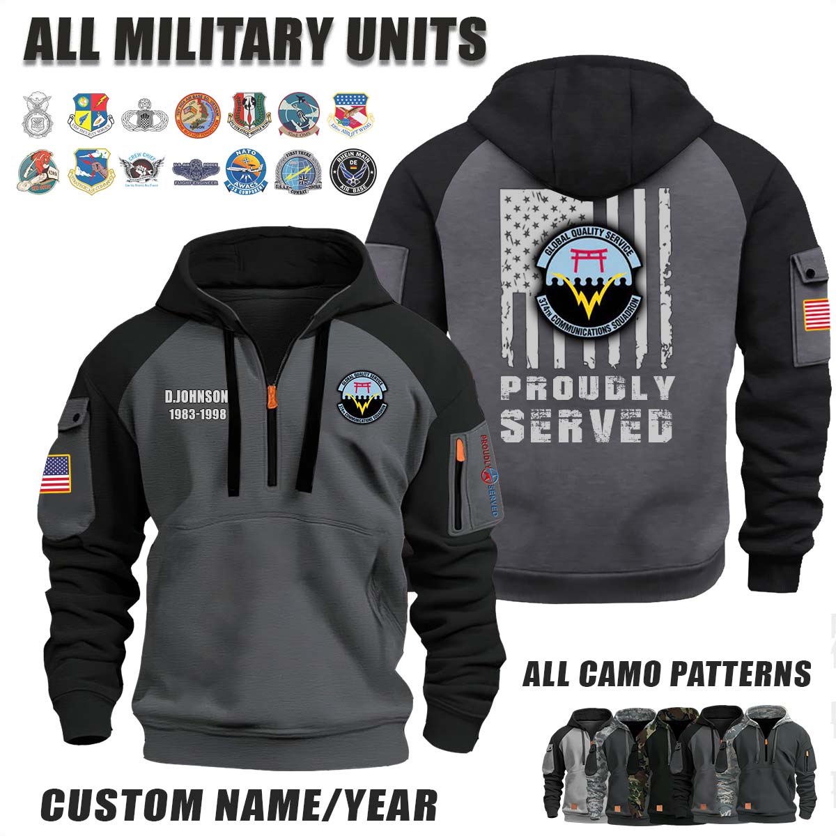 This 374th CS Communications Squadron_Camo Halfzip Hoodie lets you customize your Branch, Unit, Role, Rank, and Years Served — so your service, sacrifice, and pride live on.