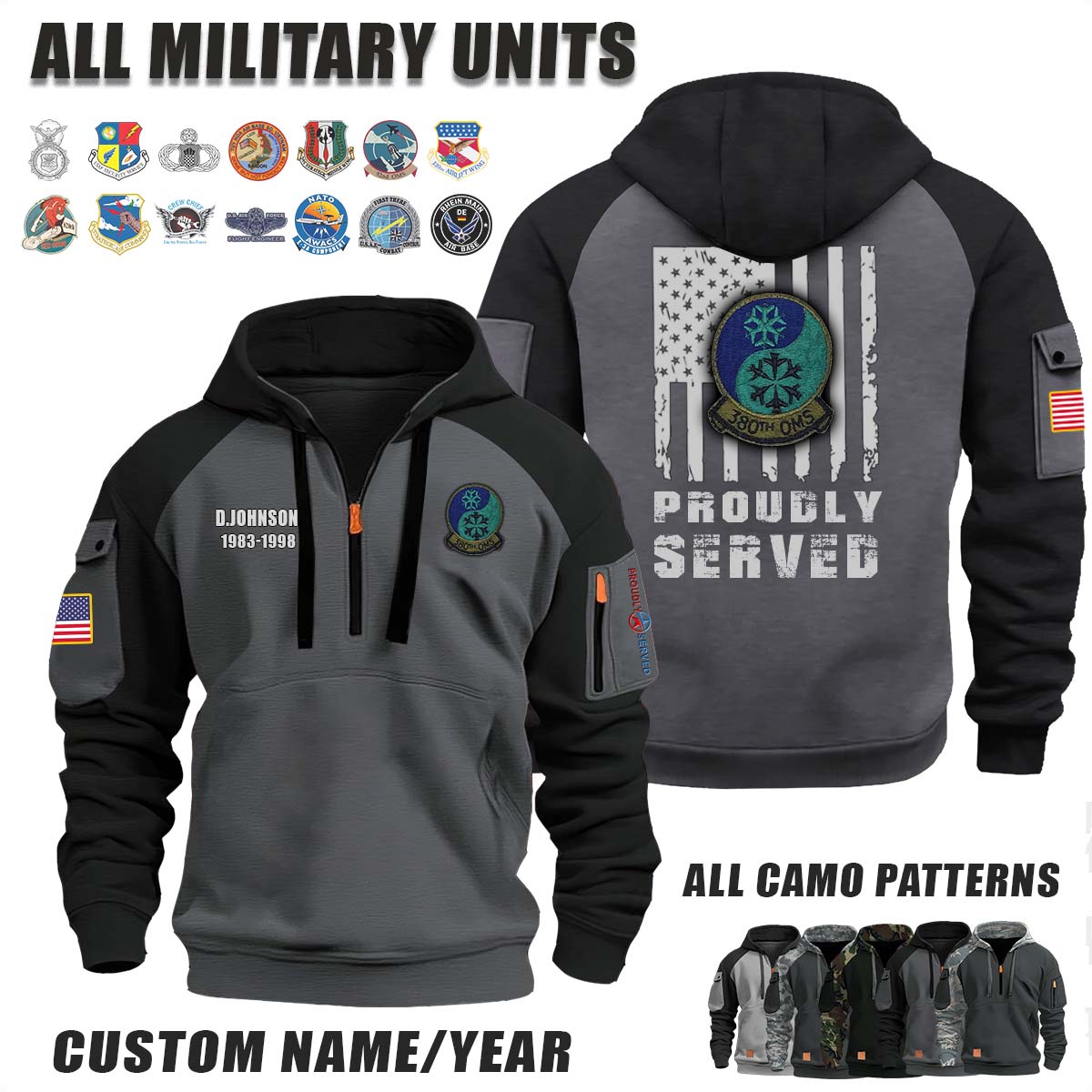 This 380th OMS Organizational Maintenance Squadron_Camo Halfzip Hoodie lets you customize your Branch, Unit, Role, Rank, and Years Served — so your service, sacrifice, and pride live on.