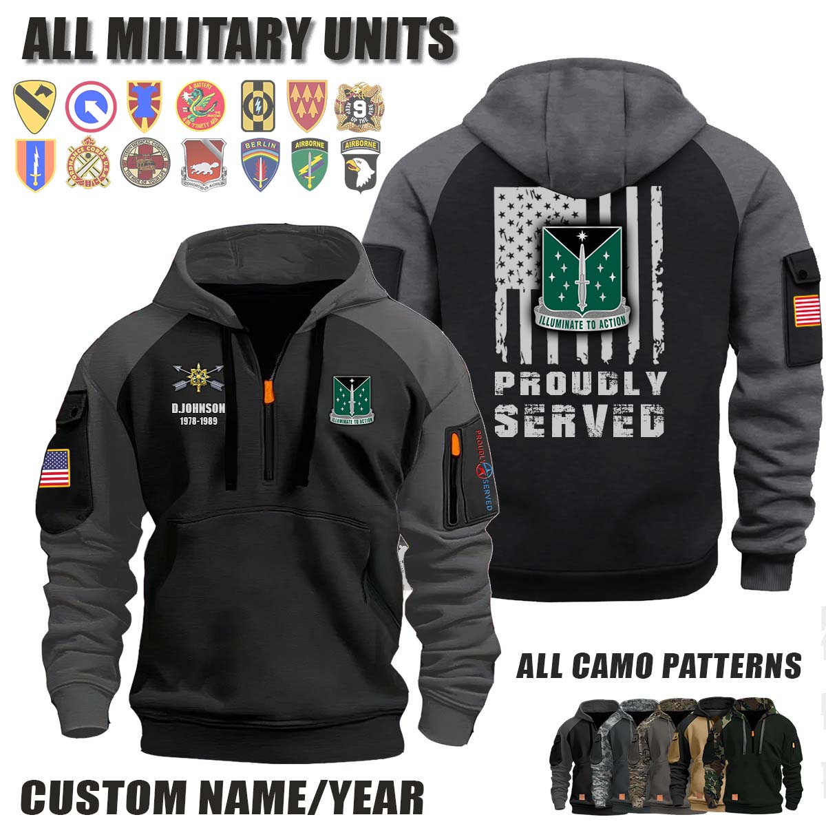 This 389th MI BN 389th Military Intelligence Battalion (SO)(A)_Camo Halfzip Hoodie lets you customize your Branch, Unit, Role, Rank, and Years Served — so your service, sacrifice, and pride live on.