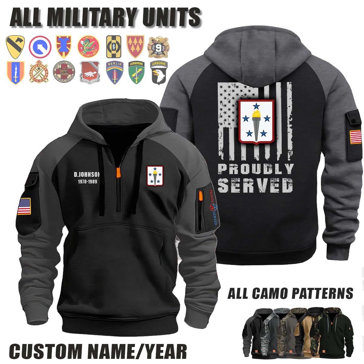 This 392nd Army Band_Camo Halfzip Hoodie lets you customize your Branch, Unit, Role, Rank, and Years Served — so your service, sacrifice, and pride live on.