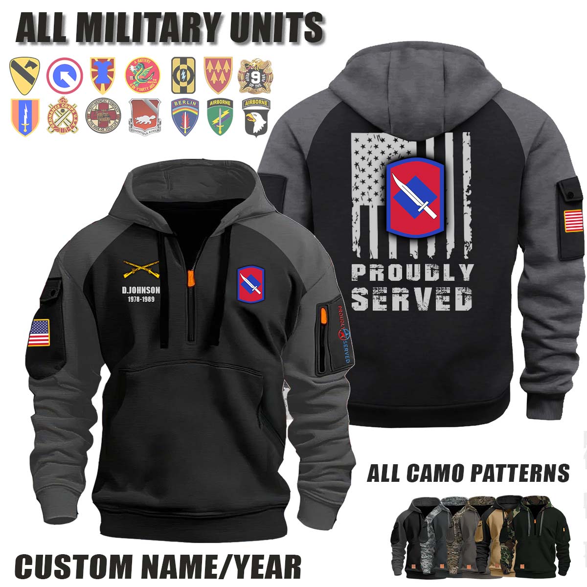 This 39th IBDE 39th Infantry Brigade Combat Team_Camo Halfzip Hoodie lets you customize your Branch, Unit, Role, Rank, and Years Served — so your service, sacrifice, and pride live on.