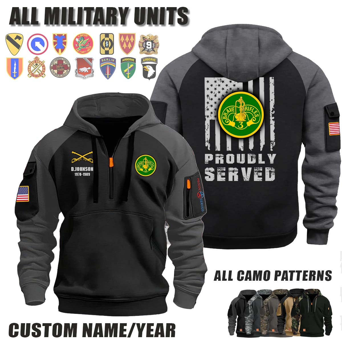 This 3rd ACR 3rd Armored Cavalry Regiment, Brave Rifles_Camo Halfzip Hoodie lets you customize your Branch, Unit, Role, Rank, and Years Served — so your service, sacrifice, and pride live on.