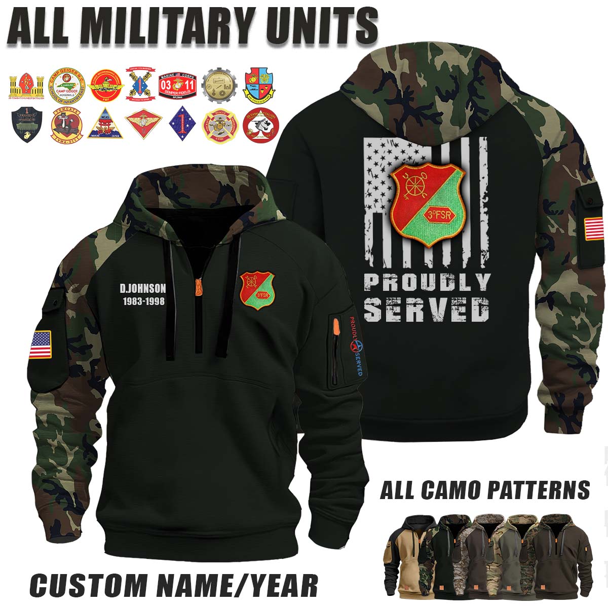 This 3rd FSR 3rd Force Service Regiment_Camo Halfzip Hoodie lets you customize your Branch, Unit, Role, Rank, and Years Served — so your service, sacrifice, and pride live on.