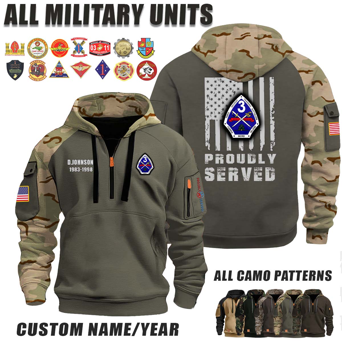 This 3rd Recruit Training Battalion_Camo Halfzip Hoodie lets you customize your Branch, Unit, Role, Rank, and Years Served — so your service, sacrifice, and pride live on.