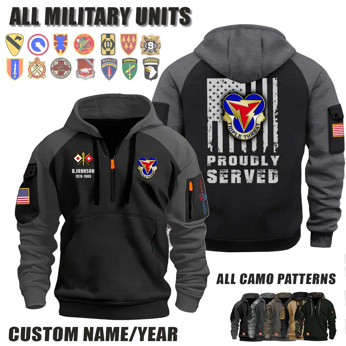 This 3rd SIG BDE 3rd Signal Brigade_Camo Halfzip Hoodie lets you customize your Branch, Unit, Role, Rank, and Years Served — so your service, sacrifice, and pride live on.