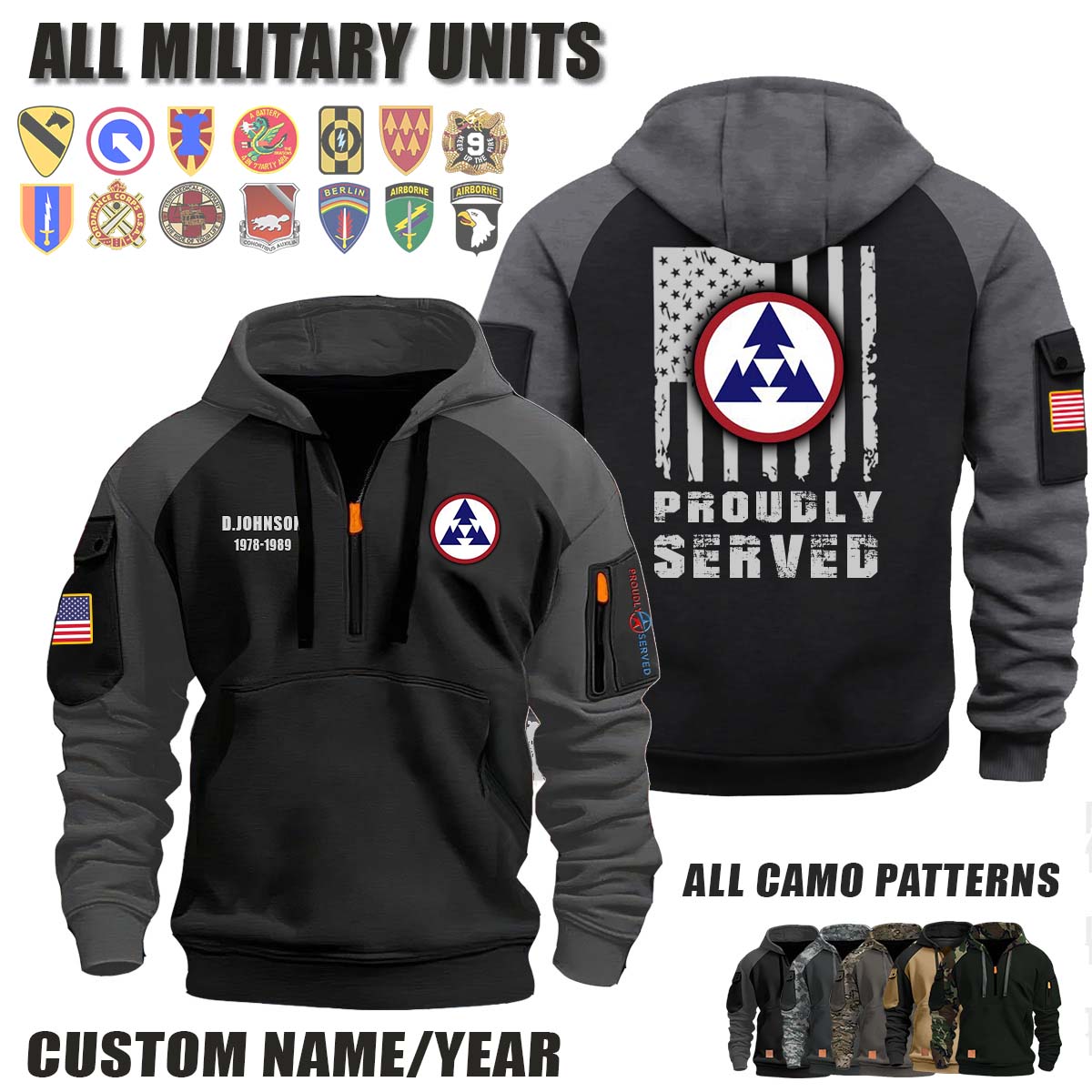 This 3rd Sustainment Command_Camo Halfzip Hoodie lets you customize your Branch, Unit, Role, Rank, and Years Served — so your service, sacrifice, and pride live on.
