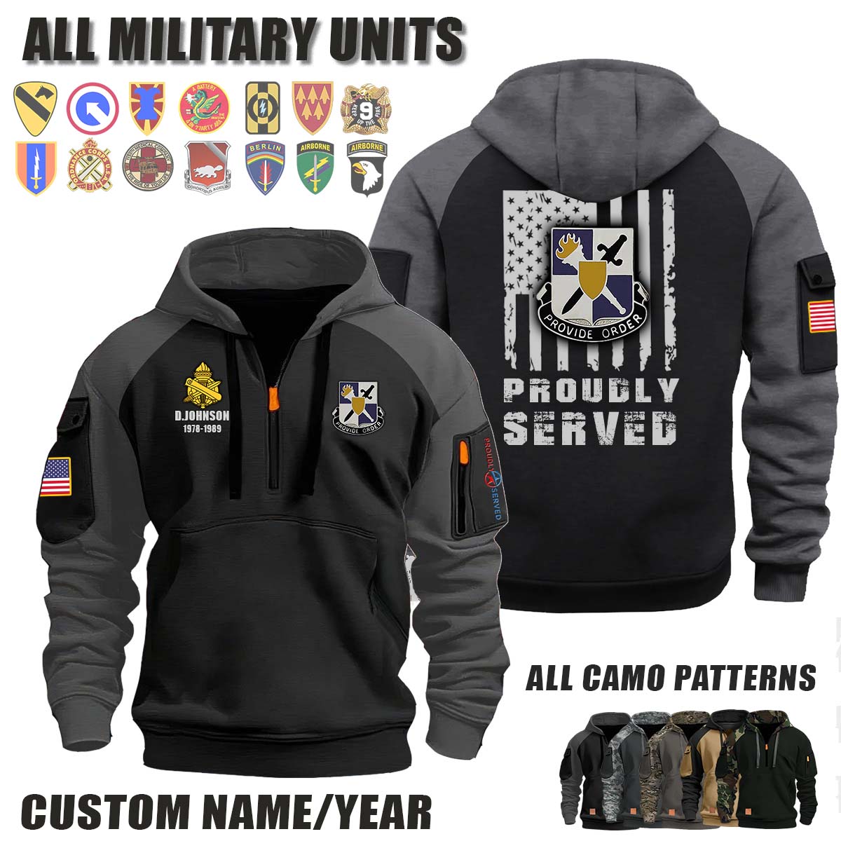 This 402nd CA BN 402nd Civil Affairs Battalion_Camo Halfzip Hoodie lets you customize your Branch, Unit, Role, Rank, and Years Served — so your service, sacrifice, and pride live on.