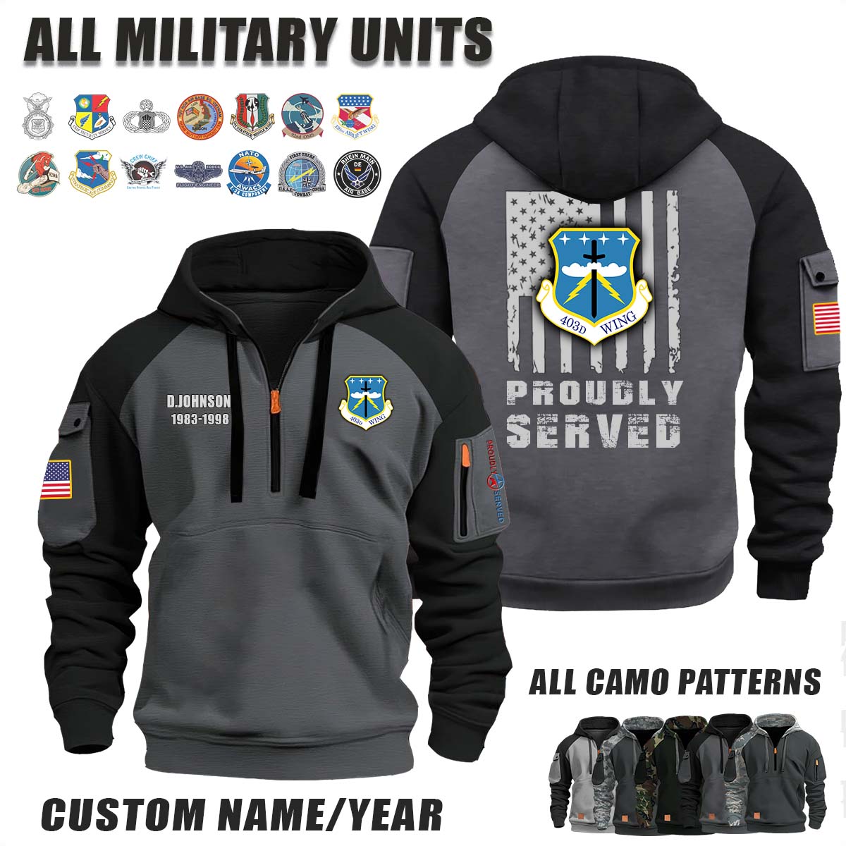 This 403rd Wing_Camo Halfzip Hoodie lets you customize your Branch, Unit, Role, Rank, and Years Served — so your service, sacrifice, and pride live on.