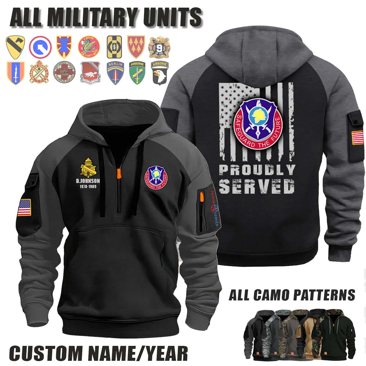 This 404th CA BN 404th Civil Affairs Battalion_Camo Halfzip Hoodie lets you customize your Branch, Unit, Role, Rank, and Years Served — so your service, sacrifice, and pride live on.