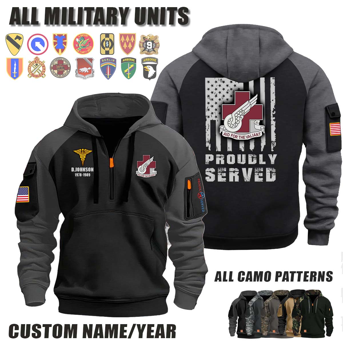 This 406th CSH 406th Combat Support Hospital_Camo Halfzip Hoodie lets you customize your Branch, Unit, Role, Rank, and Years Served — so your service, sacrifice, and pride live on.
