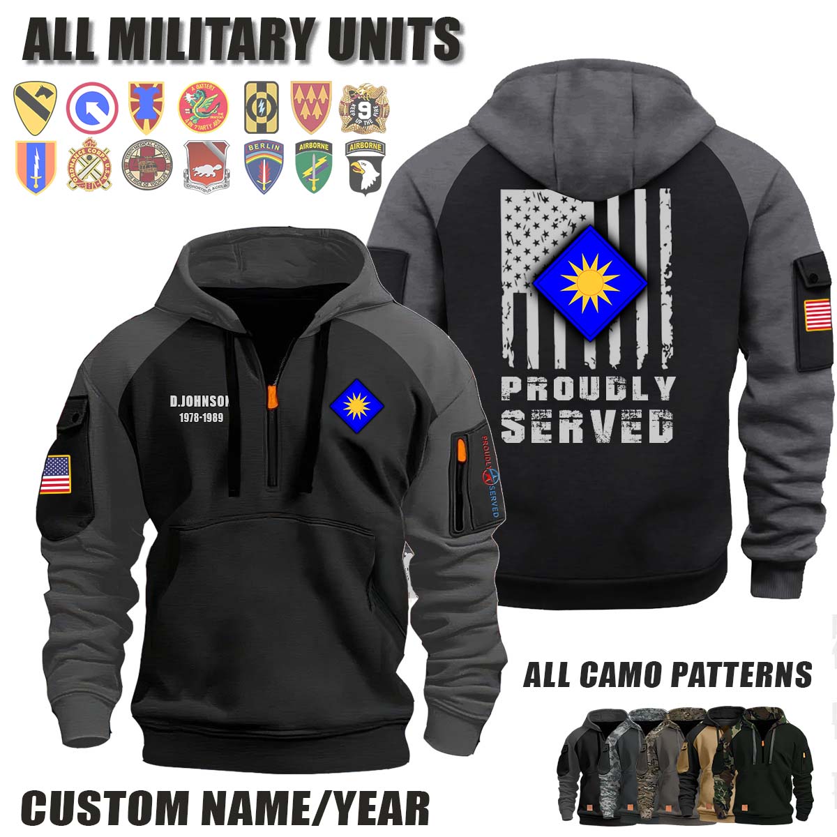 This 40th ID 40th Infantry Division_Camo Halfzip Hoodie lets you customize your Branch, Unit, Role, Rank, and Years Served — so your service, sacrifice, and pride live on.