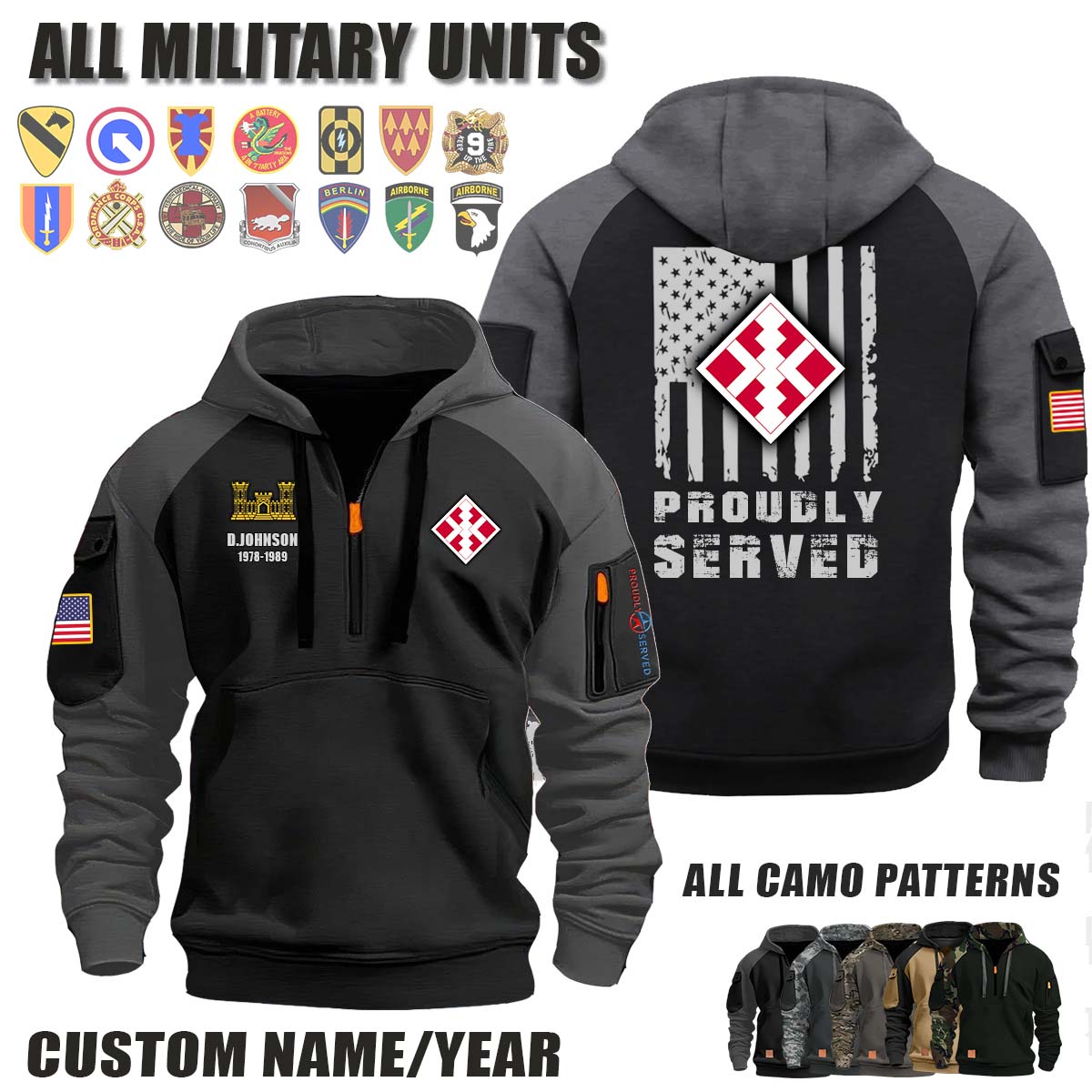 This 411th EN BDE 411th Engineer Brigade_Camo Halfzip Hoodie lets you customize your Branch, Unit, Role, Rank, and Years Served — so your service, sacrifice, and pride live on.