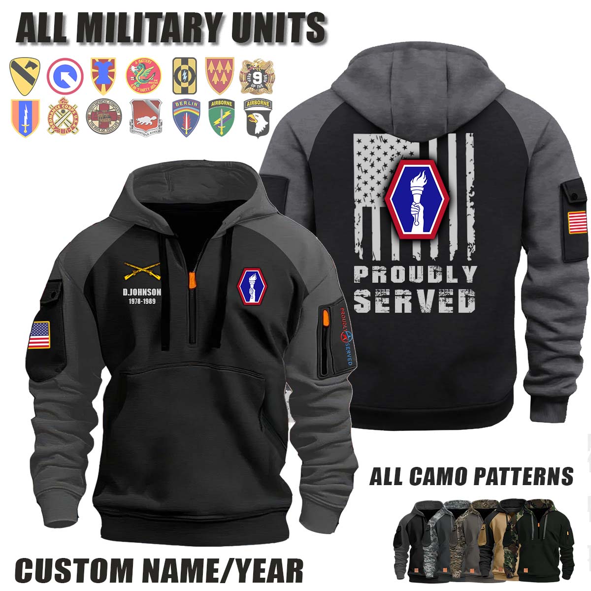 This 442nd Infantry Regiment_Camo Halfzip Hoodie lets you customize your Branch, Unit, Role, Rank, and Years Served — so your service, sacrifice, and pride live on.