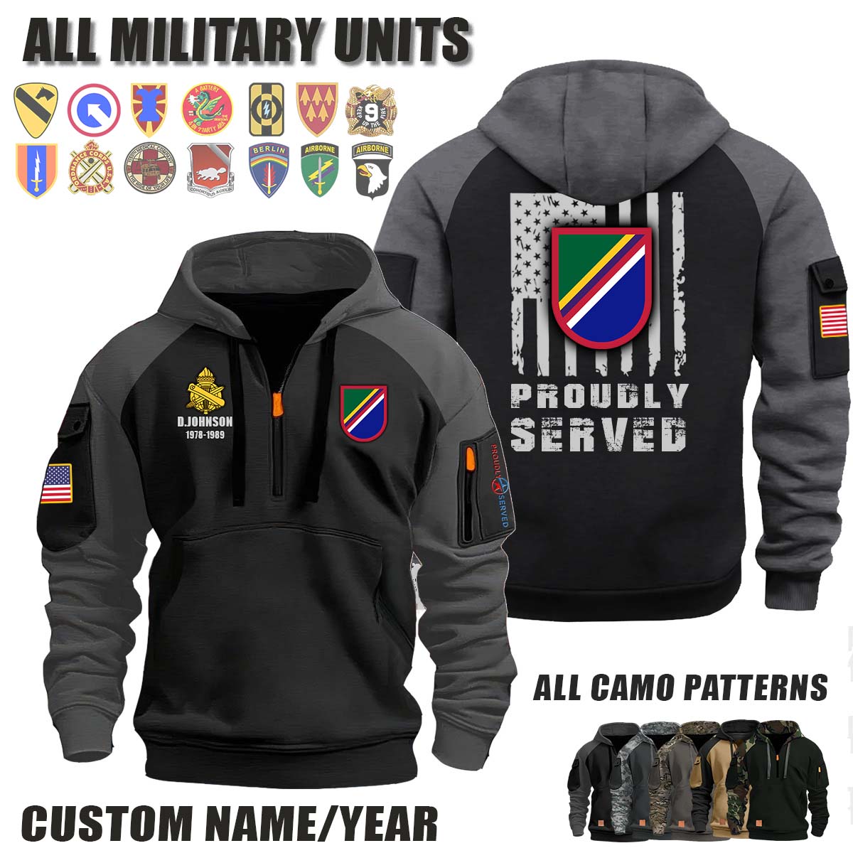 This 450th CA BN 450th Civil Affairs Battalion (Airborne) _Camo Halfzip Hoodie lets you customize your Branch, Unit, Role, Rank, and Years Served — so your service, sacrifice, and pride live on.