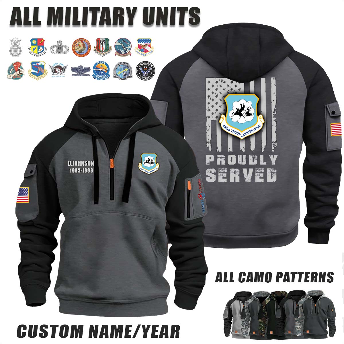 This 463rd TCW Troop Carrier Wing_Camo Halfzip Hoodie lets you customize your Branch, Unit, Role, Rank, and Years Served — so your service, sacrifice, and pride live on.
