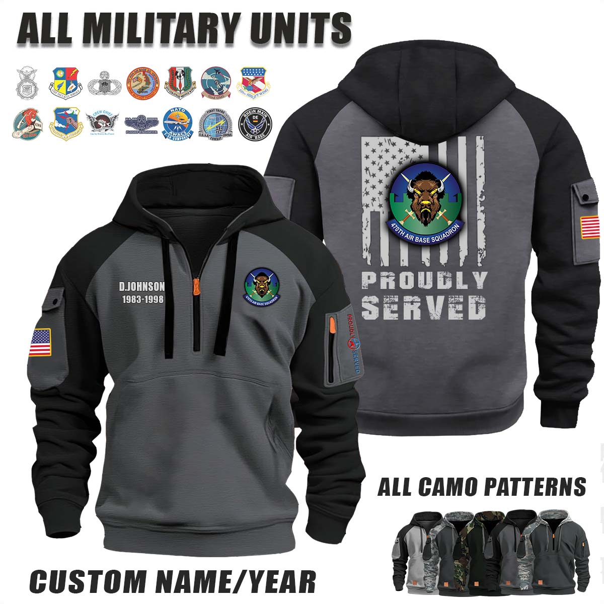 This 470th ABS 470th Air Base Squadron_Camo Halfzip Hoodie lets you customize your Branch, Unit, Role, Rank, and Years Served — so your service, sacrifice, and pride live on.