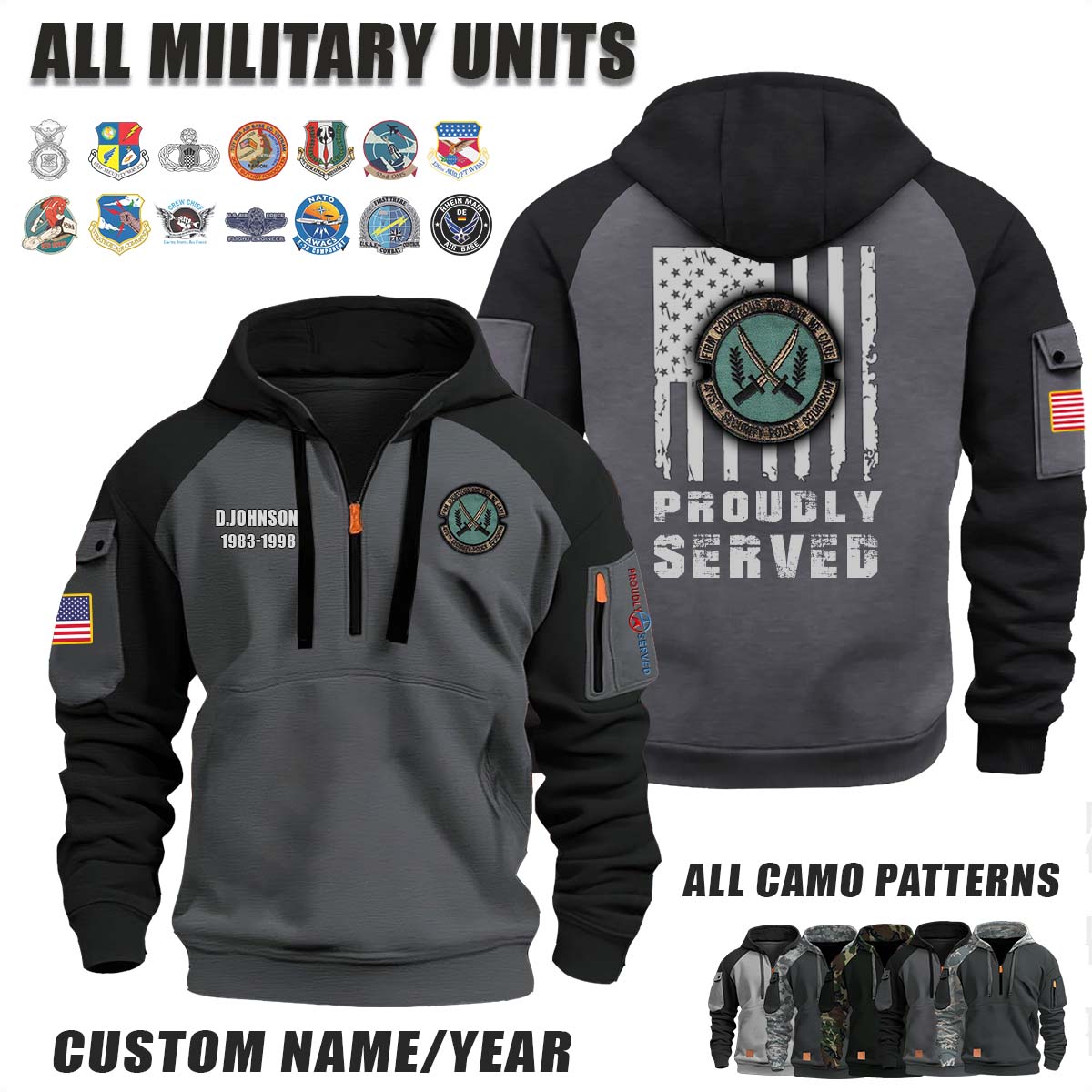 This 475th SPS 475th Security Police Squadron_Camo Halfzip Hoodie lets you customize your Branch, Unit, Role, Rank, and Years Served — so your service, sacrifice, and pride live on.