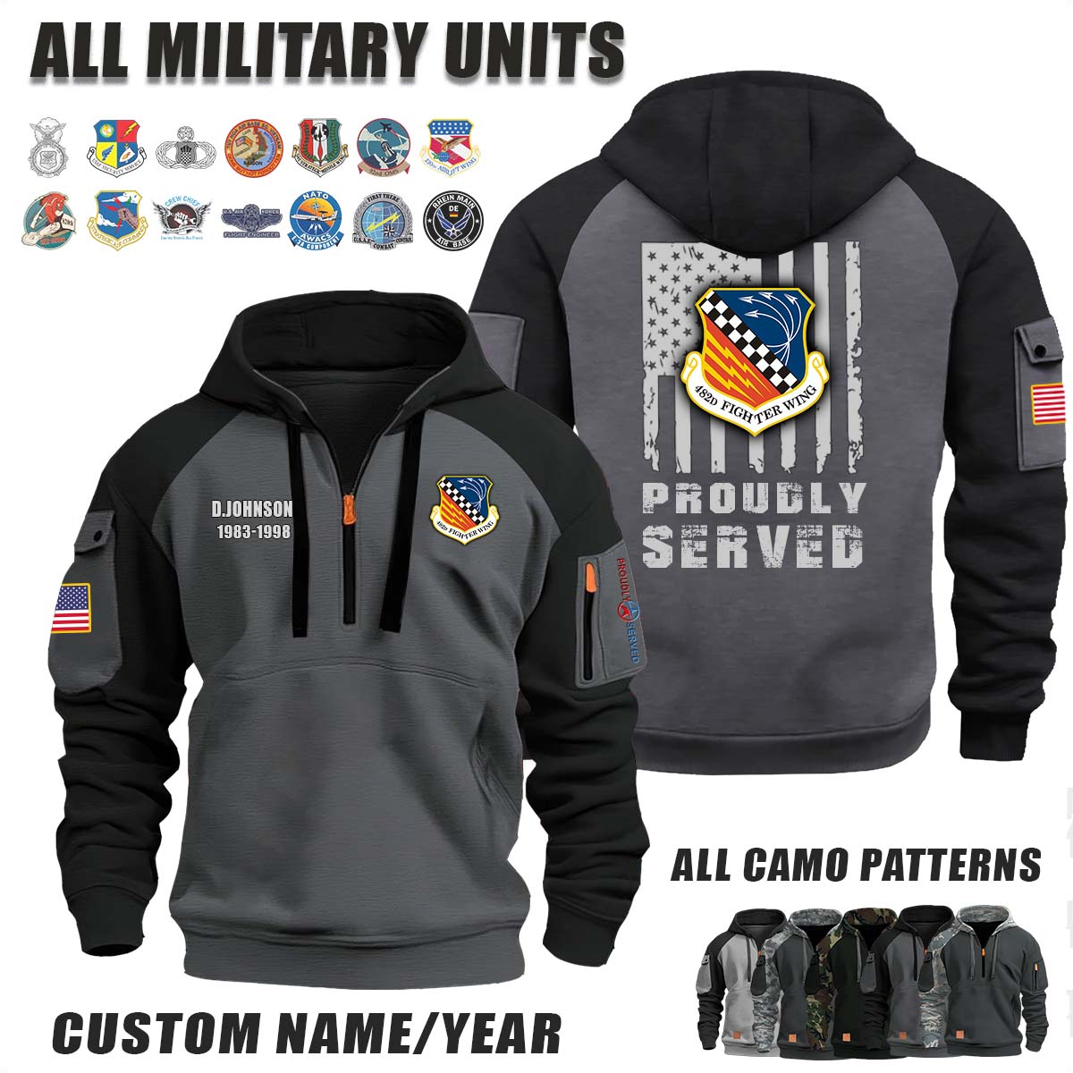 This 482nd FW Fighter Wing_Camo Halfzip Hoodie lets you customize your Branch, Unit, Role, Rank, and Years Served — so your service, sacrifice, and pride live on.
