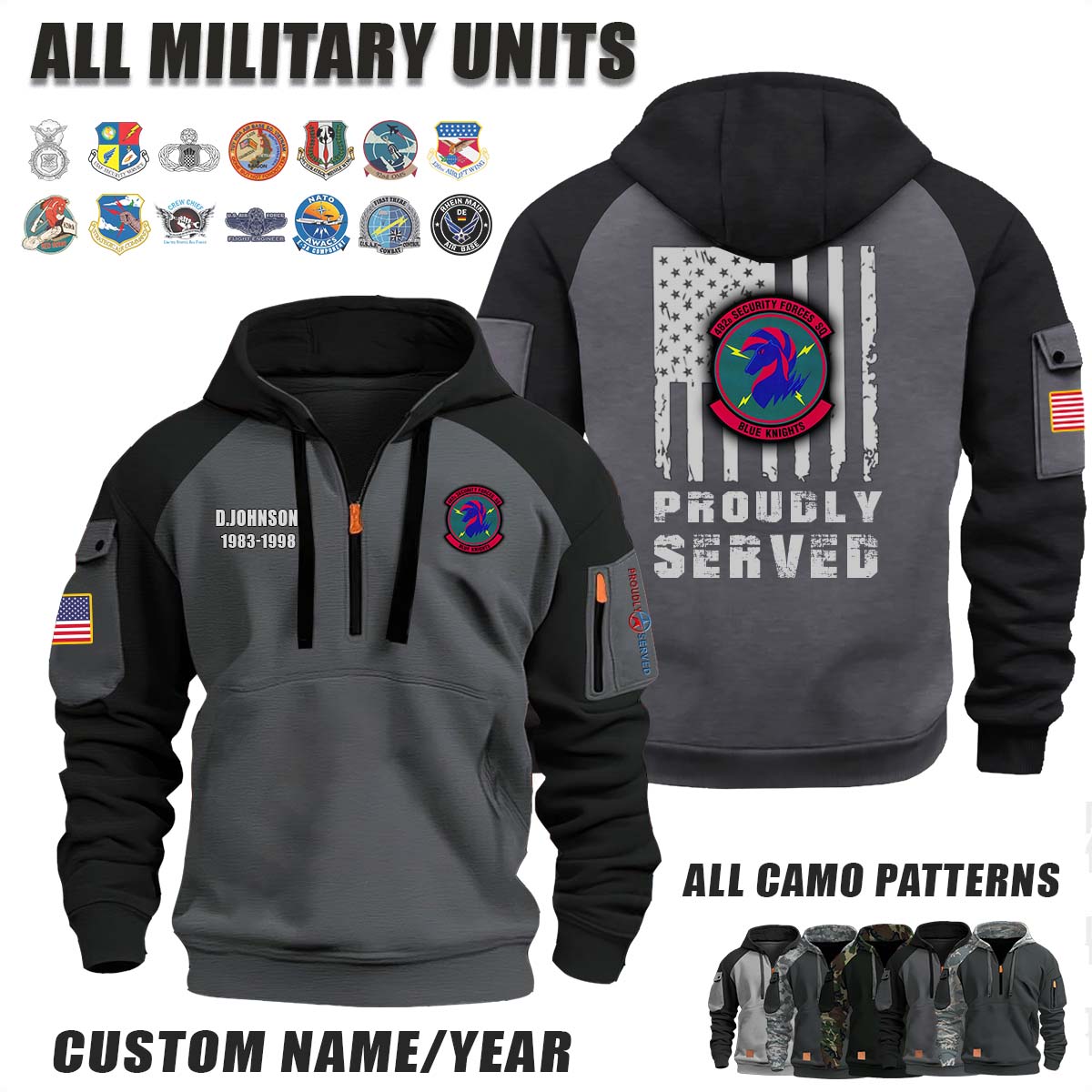 This 482nd SFS Security Forces Squadron_Camo Halfzip Hoodie lets you customize your Branch, Unit, Role, Rank, and Years Served — so your service, sacrifice, and pride live on.
