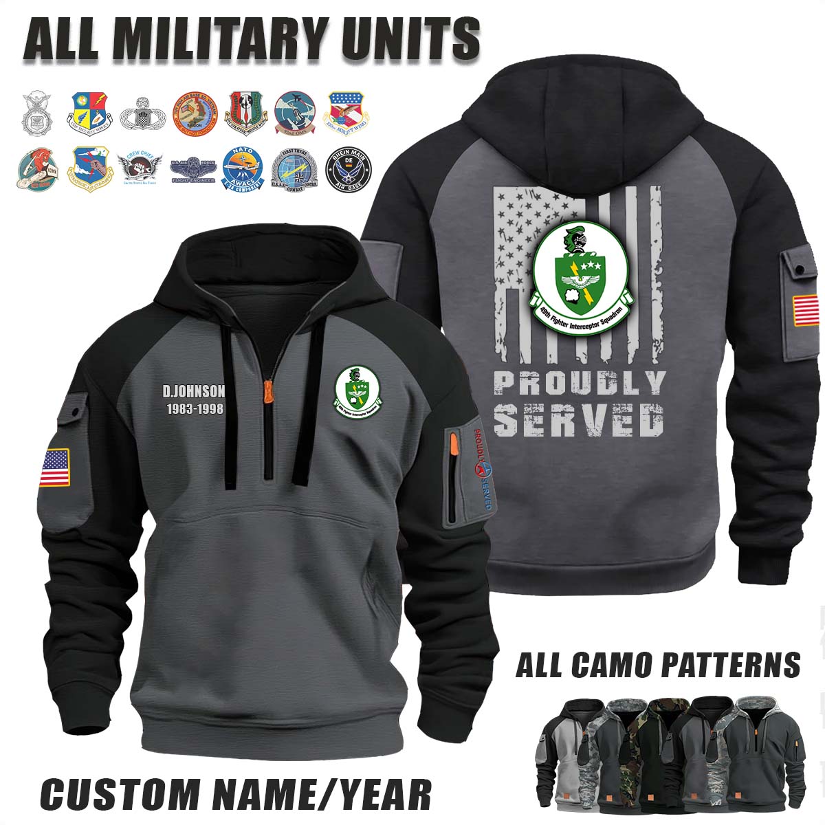 This 49th FIS Fighter Interceptor Squadron_Camo Halfzip Hoodie lets you customize your Branch, Unit, Role, Rank, and Years Served — so your service, sacrifice, and pride live on.