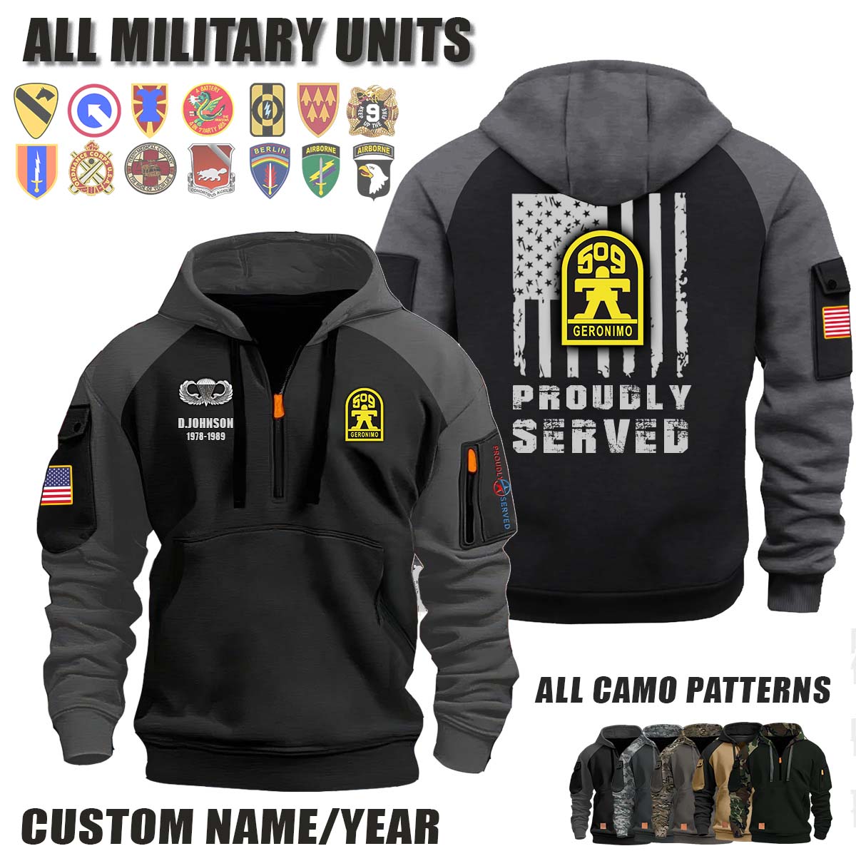 This 509th PIA 509th Parachute Infantry Association_Camo Halfzip Hoodie lets you customize your Branch, Unit, Role, Rank, and Years Served — so your service, sacrifice, and pride live on.