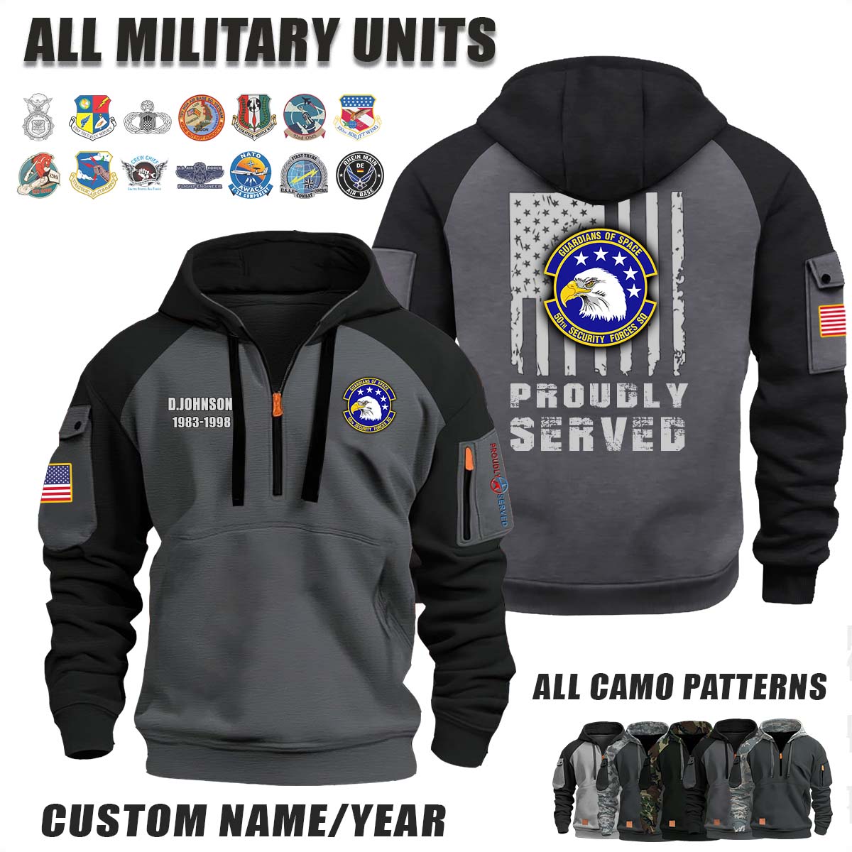 This 50th SFS Security Forces Squadron_Camo Halfzip Hoodie lets you customize your Branch, Unit, Role, Rank, and Years Served — so your service, sacrifice, and pride live on.