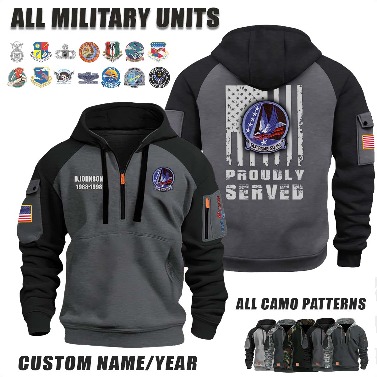This 51st BS Bomb Squadron_Camo Halfzip Hoodie lets you customize your Branch, Unit, Role, Rank, and Years Served — so your service, sacrifice, and pride live on.
