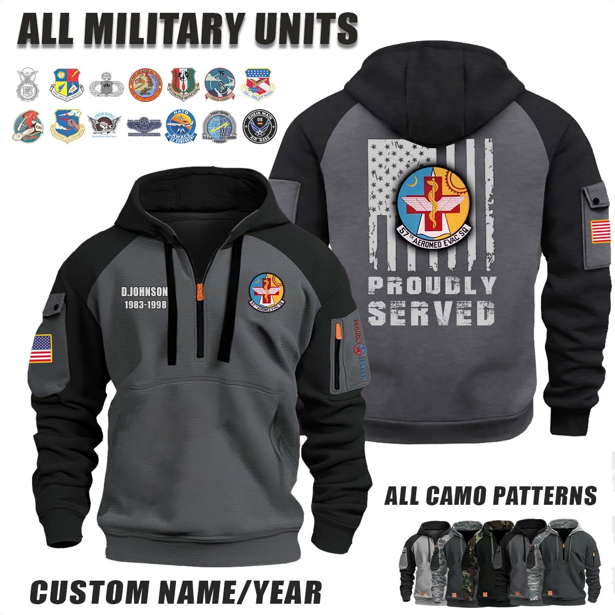 This 57th AES Aeromedical Evacuation Squadron_Camo Halfzip Hoodie lets you customize your Branch, Unit, Role, Rank, and Years Served — so your service, sacrifice, and pride live on.