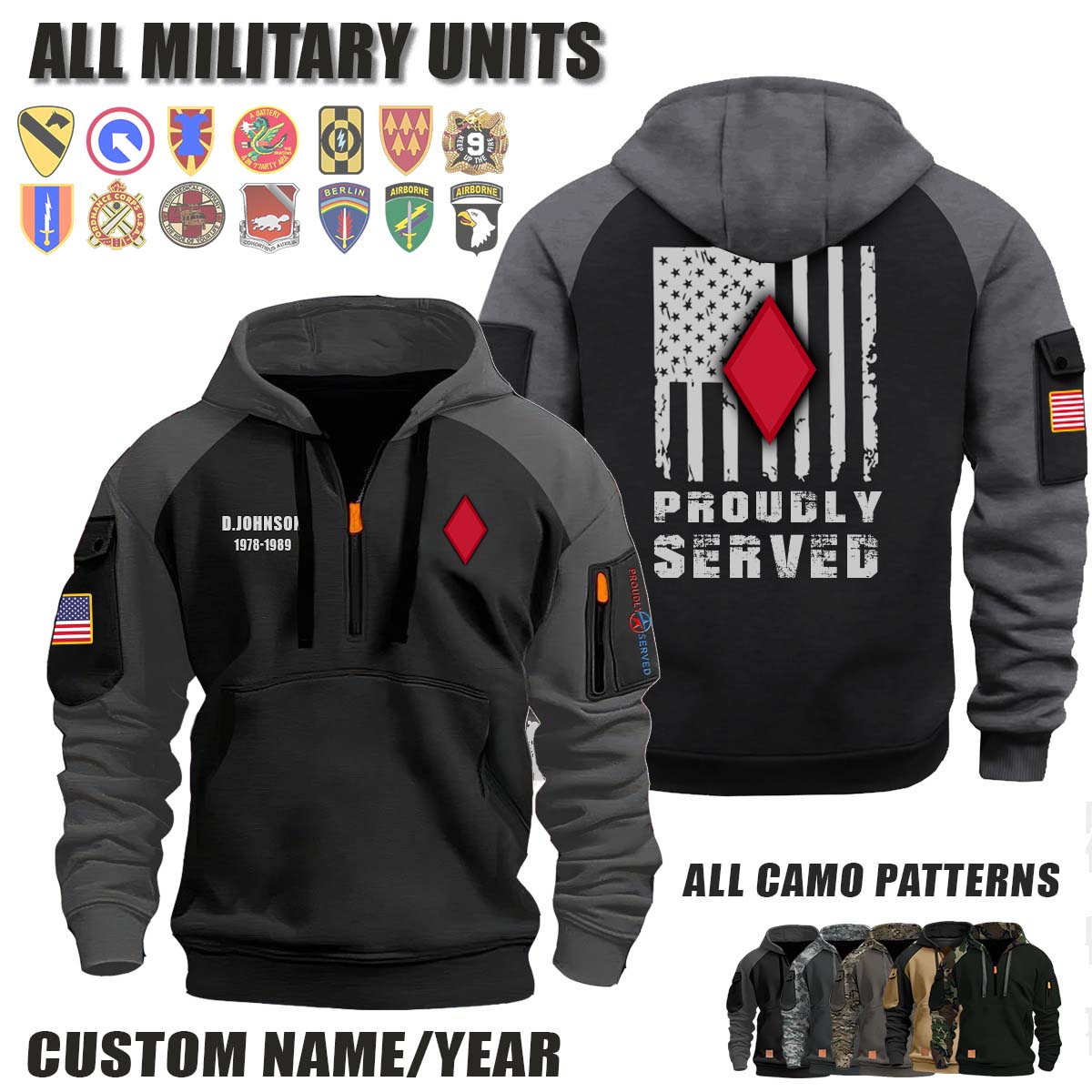 This 5th ID 5th Infantry Division_Camo Halfzip Hoodie lets you customize your Branch, Unit, Role, Rank, and Years Served — so your service, sacrifice, and pride live on.