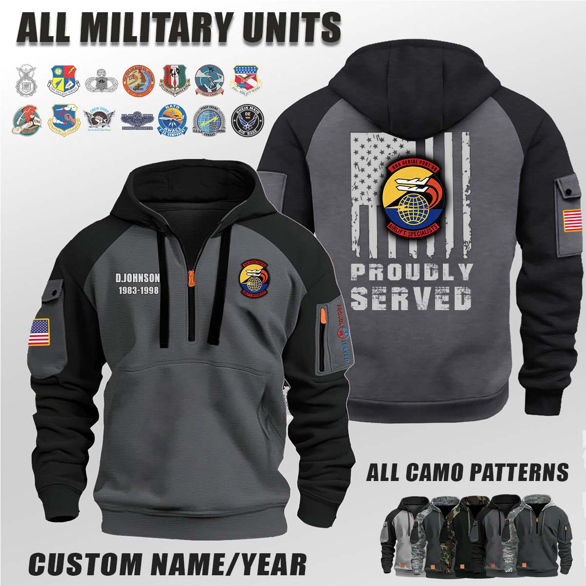 This 608th APS Aerial Port Squadron_Camo Halfzip Hoodie lets you customize your Branch, Unit, Role, Rank, and Years Served — so your service, sacrifice, and pride live on.