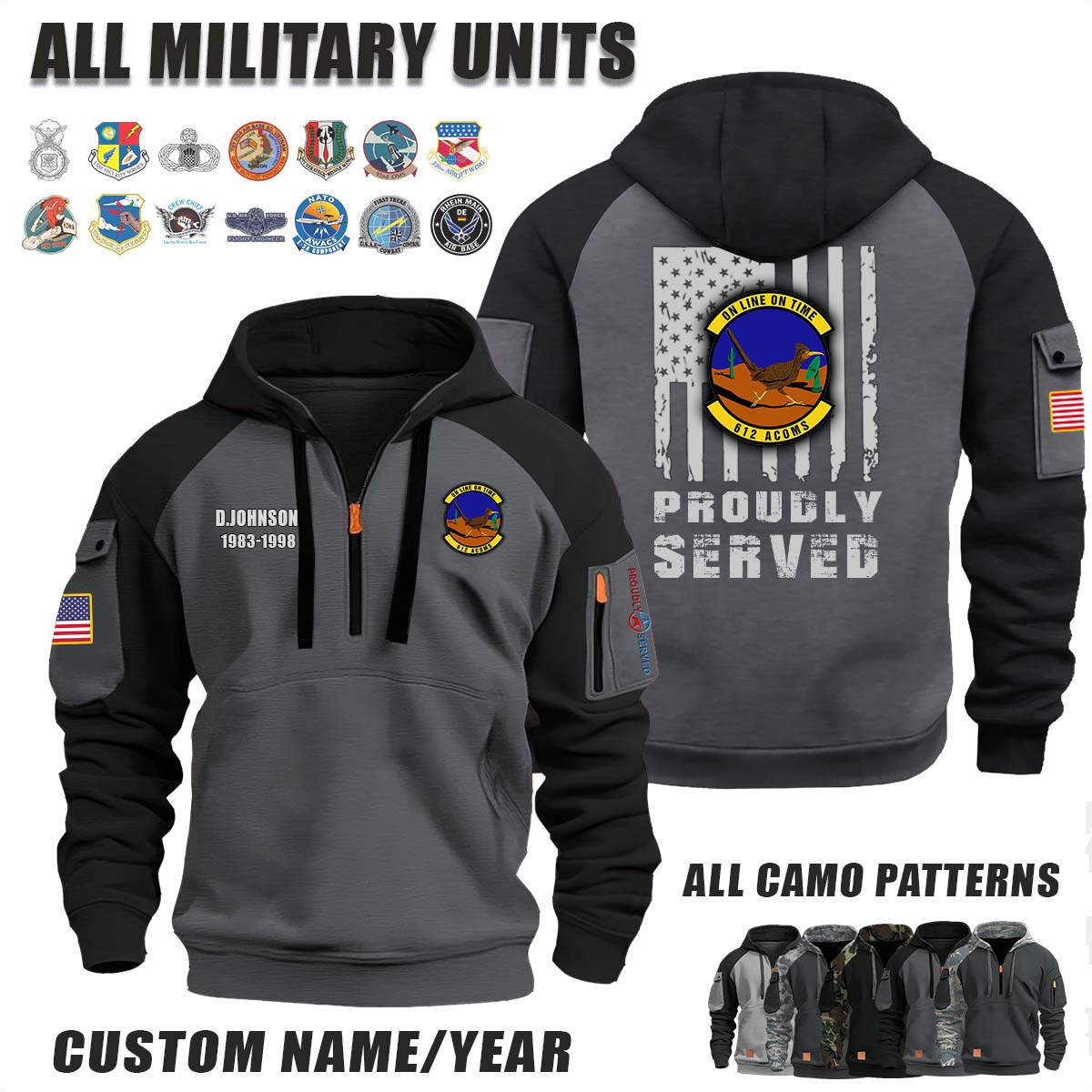 This 612th ACOMS Air Communications Squadron_Camo Halfzip Hoodie lets you customize your Branch, Unit, Role, Rank, and Years Served — so your service, sacrifice, and pride live on.