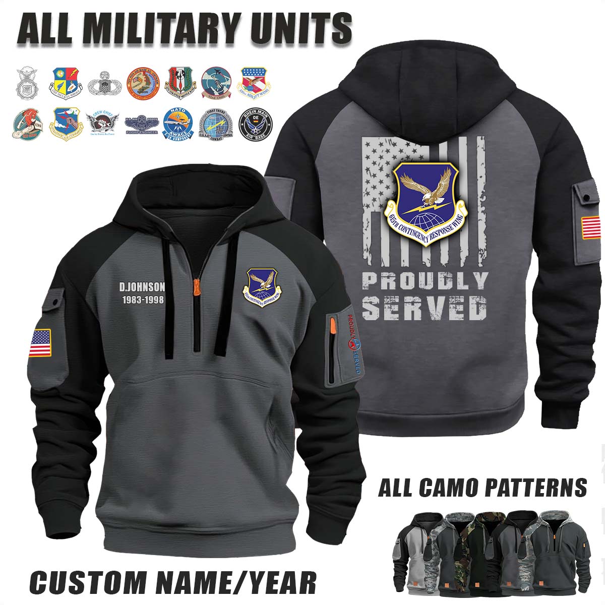 This 615th CRW Contingency Response Wing_Camo Halfzip Hoodie lets you customize your Branch, Unit, Role, Rank, and Years Served — so your service, sacrifice, and pride live on.