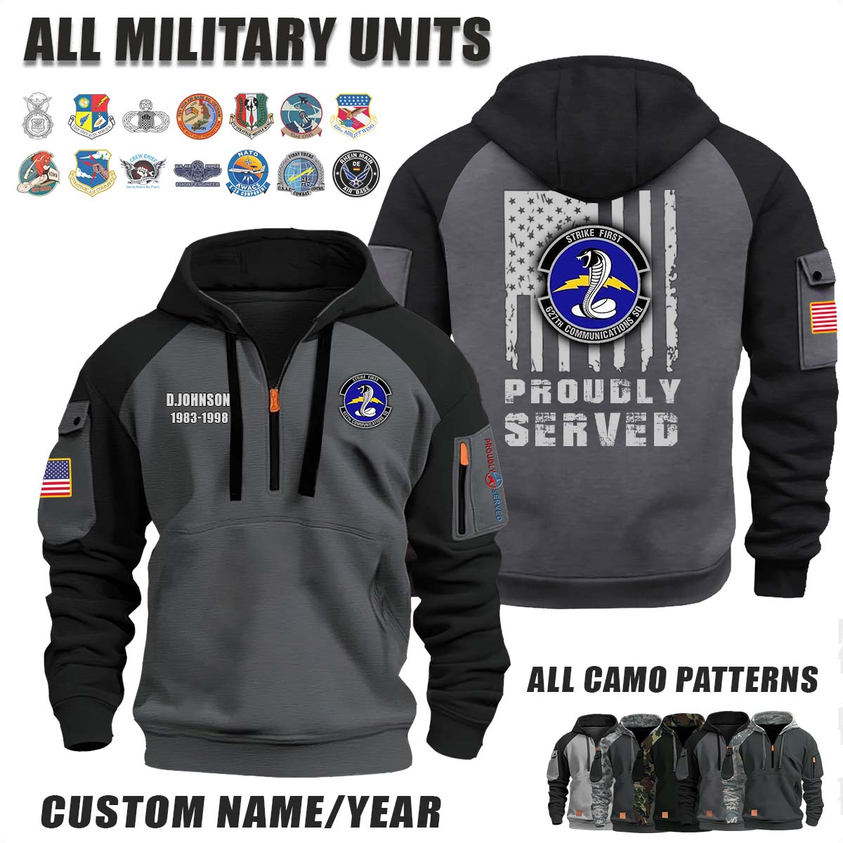 This 627th CS Communications Squadron_Camo Halfzip Hoodie lets you customize your Branch, Unit, Role, Rank, and Years Served — so your service, sacrifice, and pride live on.