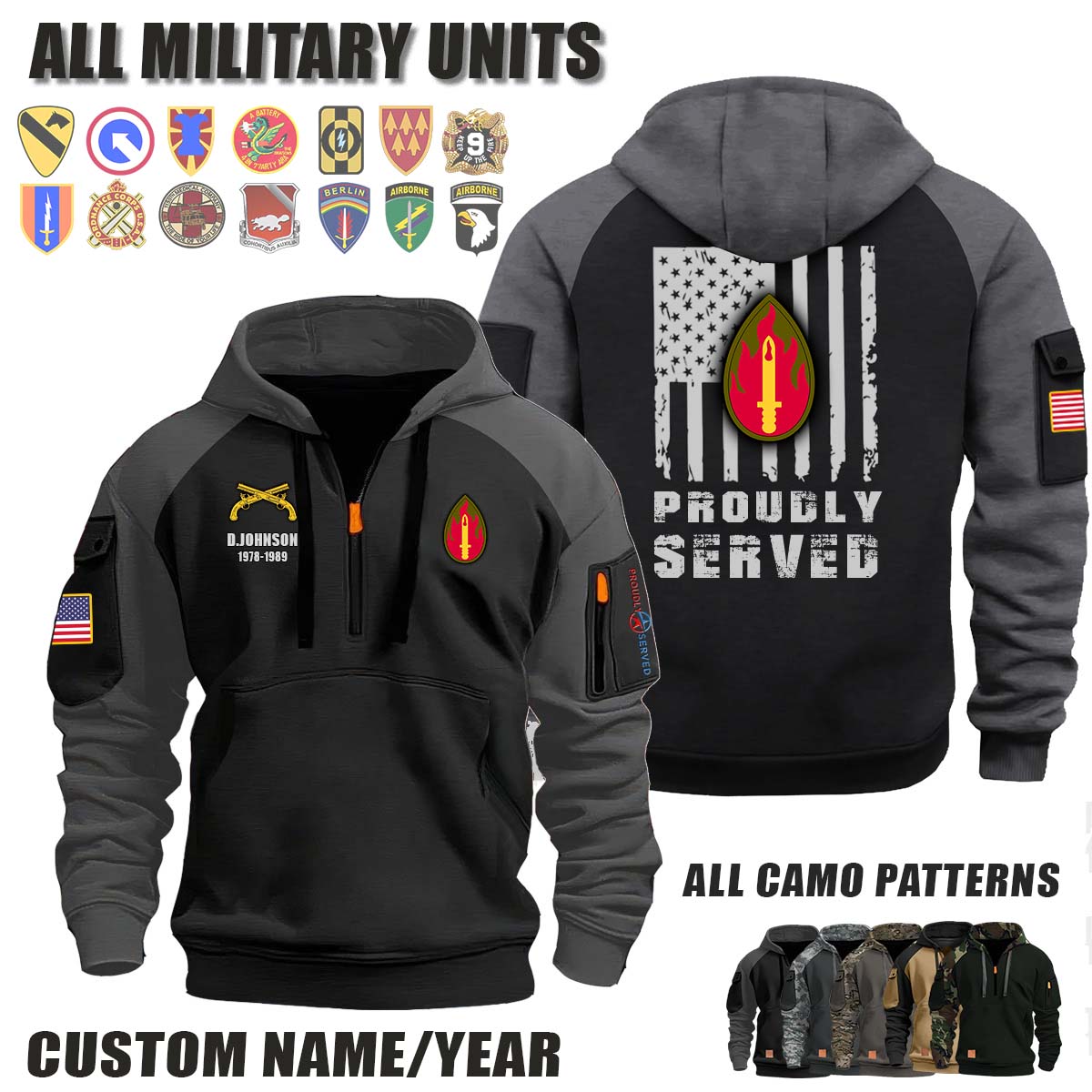 This 6632nd MP Port Security_Camo Halfzip Hoodie lets you customize your Branch, Unit, Role, Rank, and Years Served — so your service, sacrifice, and pride live on.