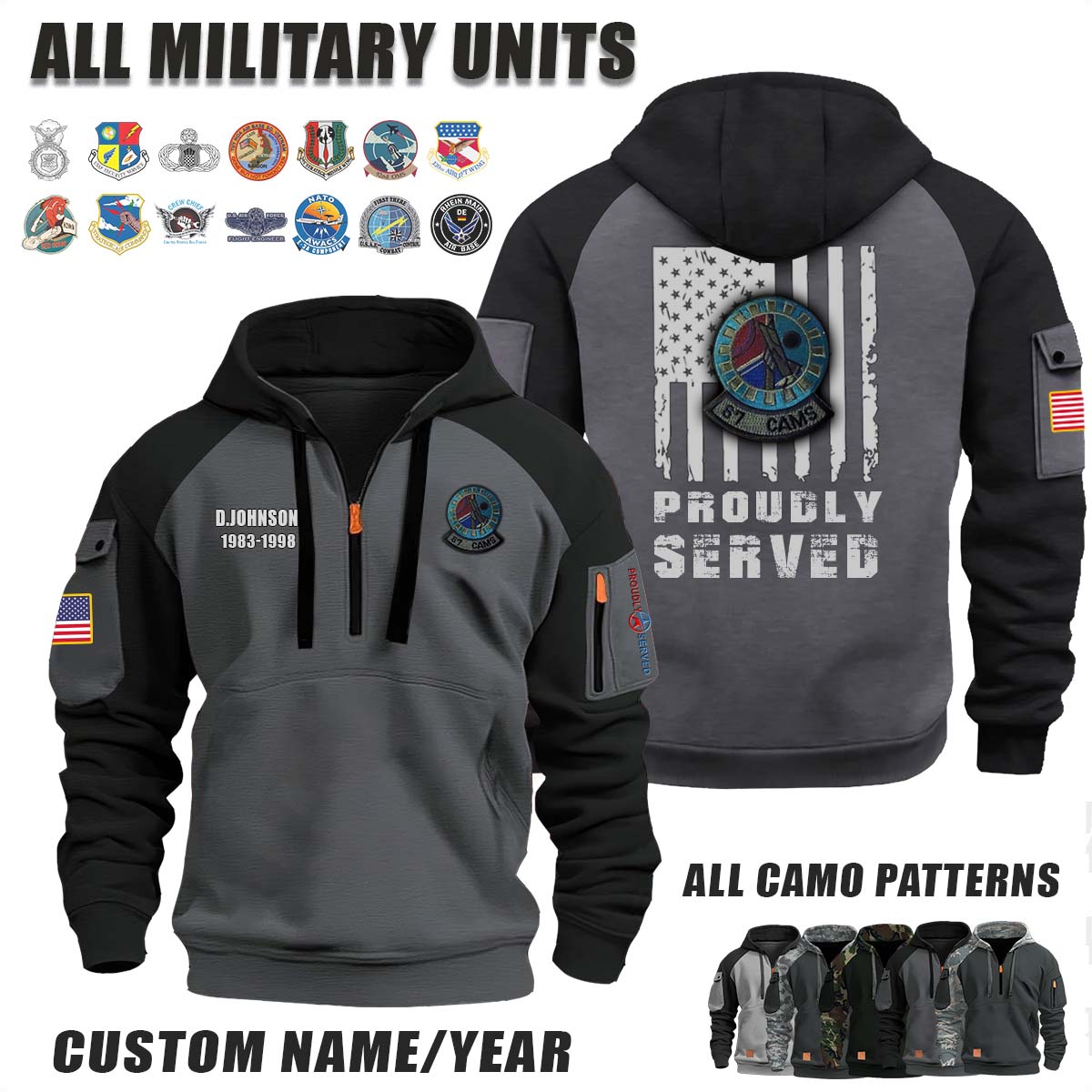 This 67th CAMS 67th Consolidated Aircraft Maintenance Squadron_Camo Halfzip Hoodie lets you customize your Branch, Unit, Role, Rank, and Years Served — so your service, sacrifice, and pride live on.