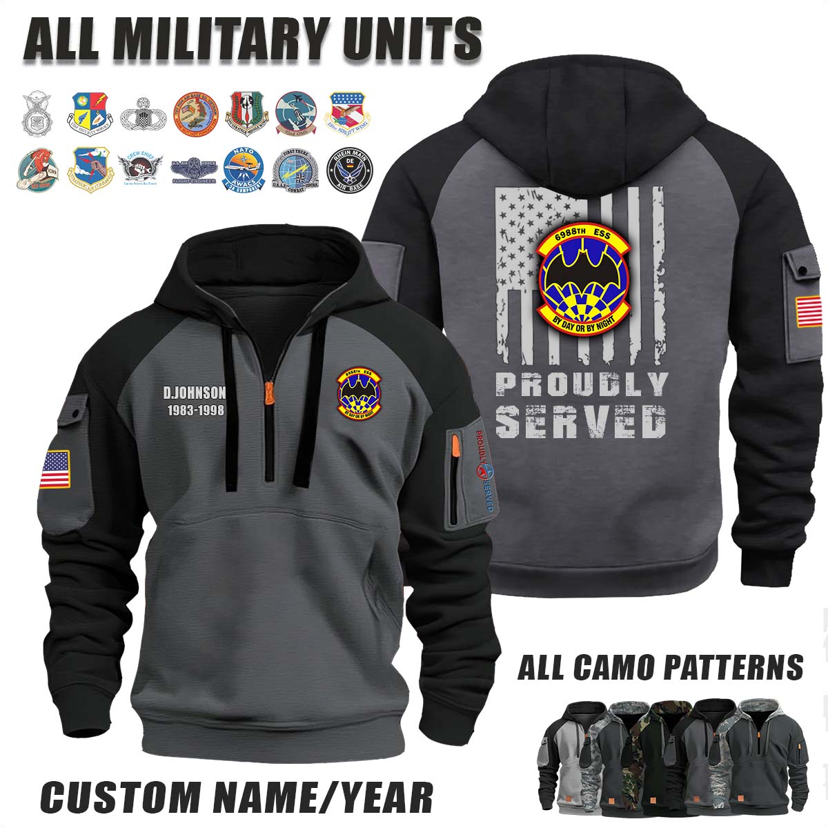 This 6988th ESS Electronic Security Squadron_Camo Halfzip Hoodie lets you customize your Branch, Unit, Role, Rank, and Years Served — so your service, sacrifice, and pride live on.