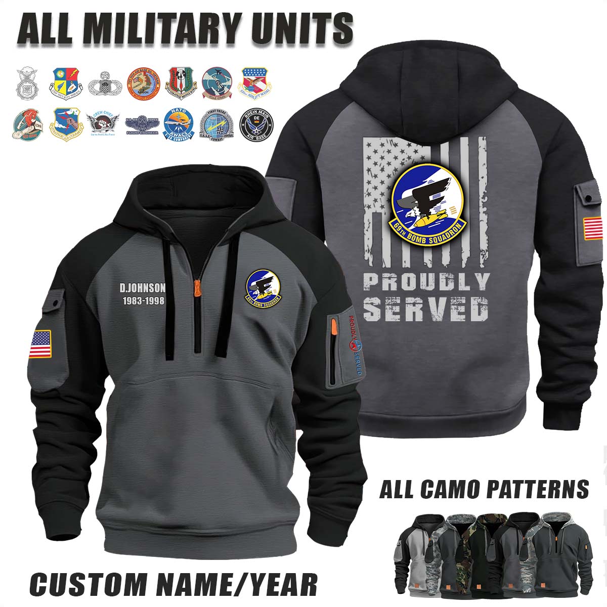 This 69th BS Bomb Squadron_Camo Halfzip Hoodie lets you customize your Branch, Unit, Role, Rank, and Years Served — so your service, sacrifice, and pride live on.